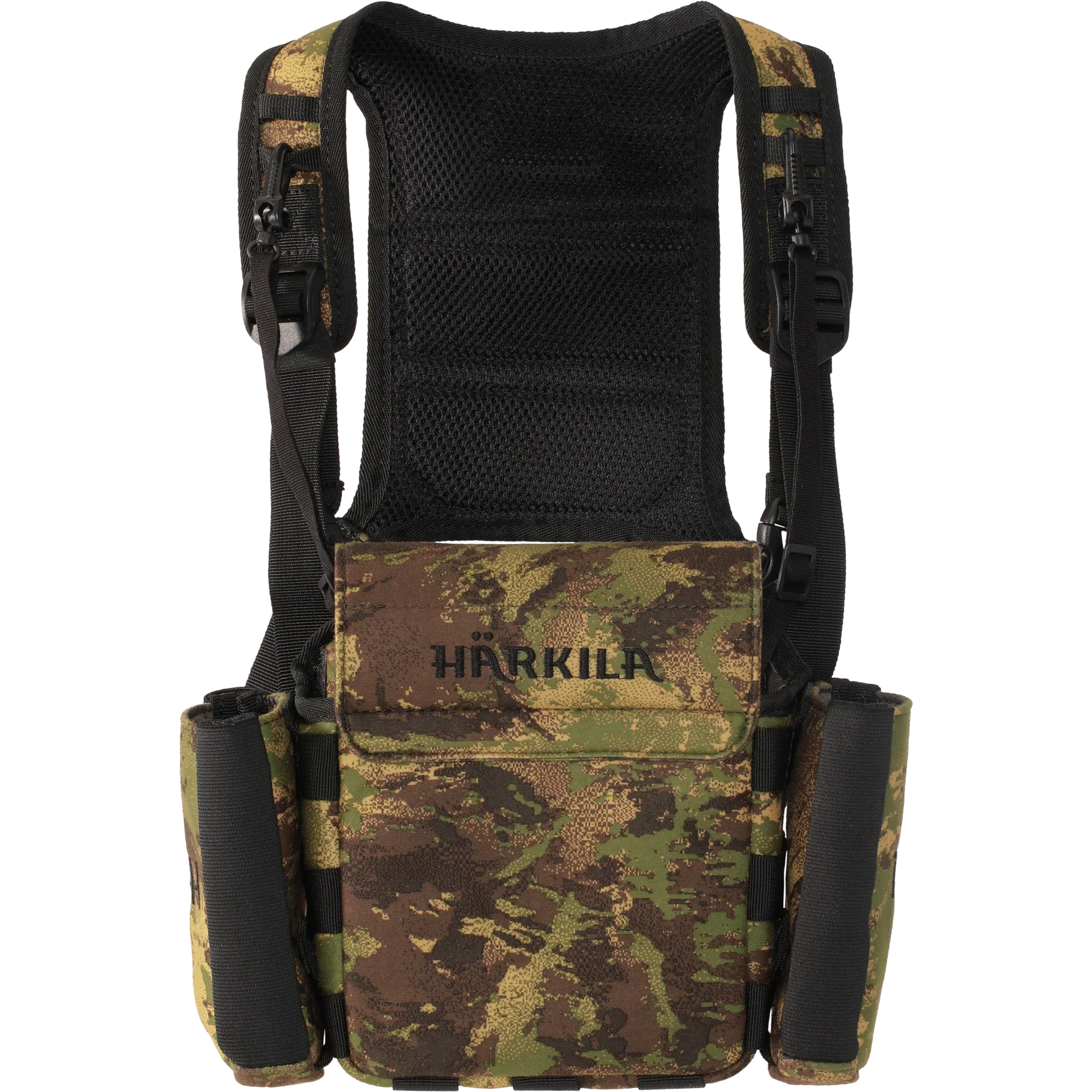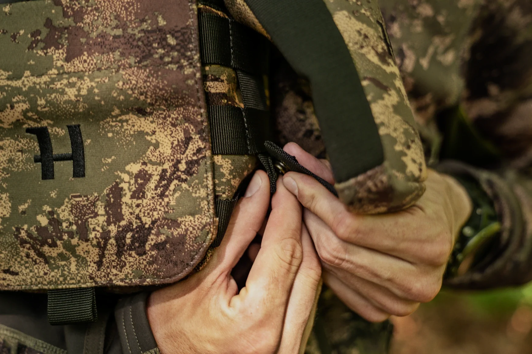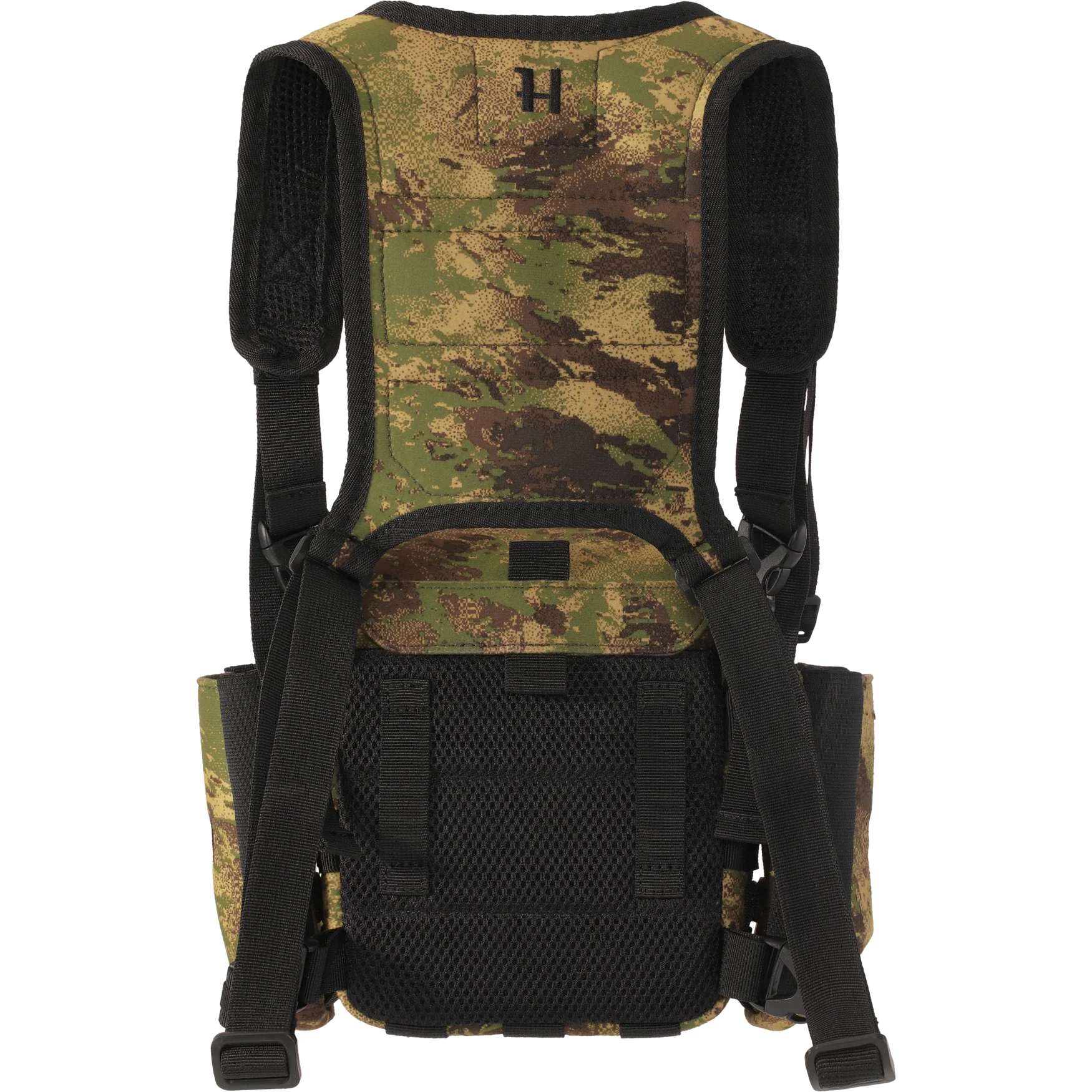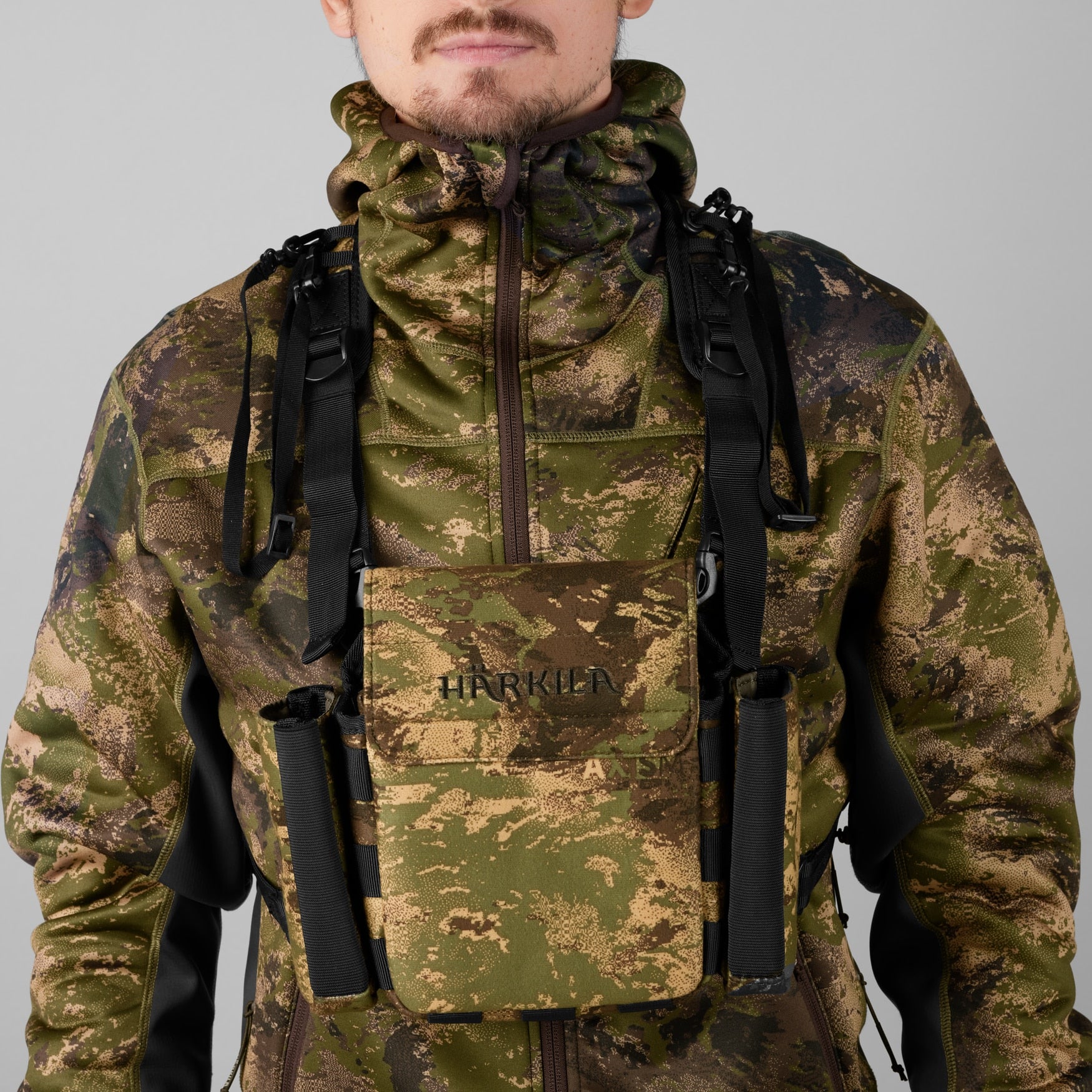 La correa para prismáticos Deer Stalker le ofrece un control absoluto de sus prismáticos cuando sale a cazar. Su sistema de arnés evita que queden colgando del cuello mientras te mueves. Una gran solapa con un cierre magnético silencioso protege los prismáticos cuando no se utilizan, y la correa puede ajustarse para modelos de prismáticos grandes o pequeños. También puede quitar la propia funda de los prismáticos y utilizar sólo el sistema de arnés para mantener los prismáticos en su sitio en el pecho. A cada lado y en la parte inferior de la correa de los binoculares hay lazos MOLLE, para fijar los dos bolsillos extensibles suministrados con la correa u otros artículos compatibles con MOLLE. Puede, por ejemplo, colocar un soporte para su telémetro, una botella para comprobar el viento u otros artículos que utilice junto con sus prismáticos. La correa de los binoculares está fabricada con un material de tricot suave y muy poco ruidoso y cuenta con el camuflaje MSP de AXIS, que interrumpe la silueta del cazador y hace que el portador se funda con el fondo. MSP son las siglas de Multi Season Pattern, y, como su nombre indica, este camuflaje fue diseñado para ser eficaz en una variedad de terrenos en diferentes épocas del año. En la parte posterior de la correa hay un bolsillo de buen tamaño para el teléfono móvil, un pequeño mapa o algo similar, y trabillas para el cinturón. Esto significa que puedes desmontar el sistema de arnés y llevar la funda de los prismáticos en el cinturón, si lo deseas.