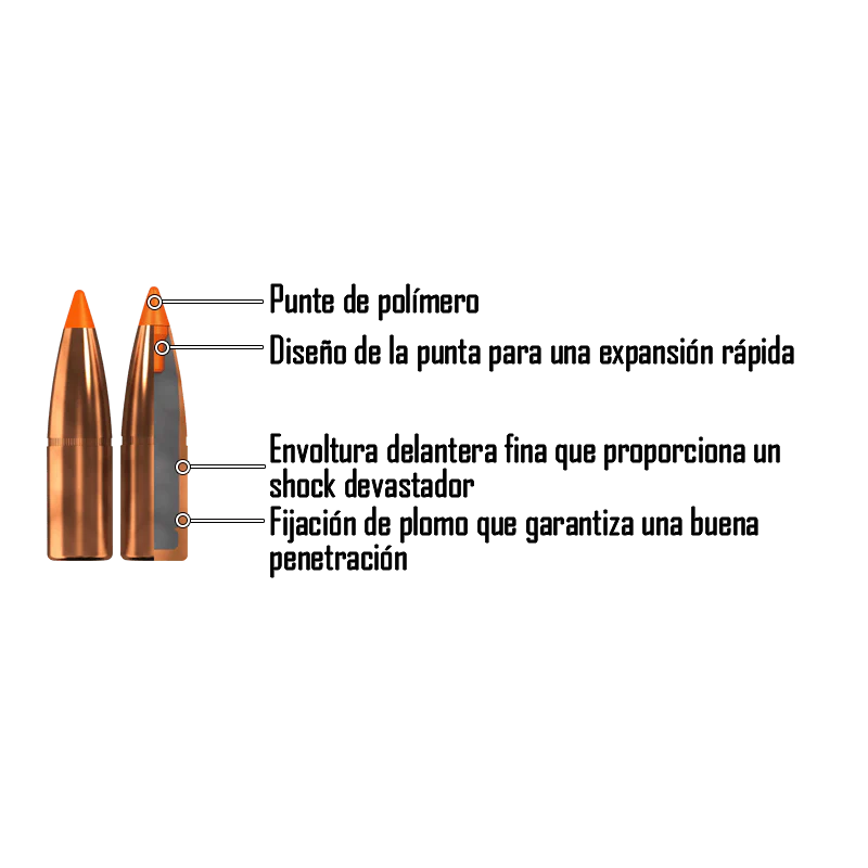 TIPSTRIKE™ está diseñada para detener la energía del animal y ofrece una penetración suficientemente profunda para alcanzar los órganos vitales de la presa. La punta de polímero garantiza la expansión y proporciona un efecto de choque devastador gracias al diseño de la cubierta de la bala. Para garantizar una alta retención de peso, la cubierta está reforzada con un bloqueo mecánico que convierte a TIPSTRIKE™ en una bala extraordinaria para cazas dirigidas y otros tipos de caza en los que la detención inmediata es crucial.