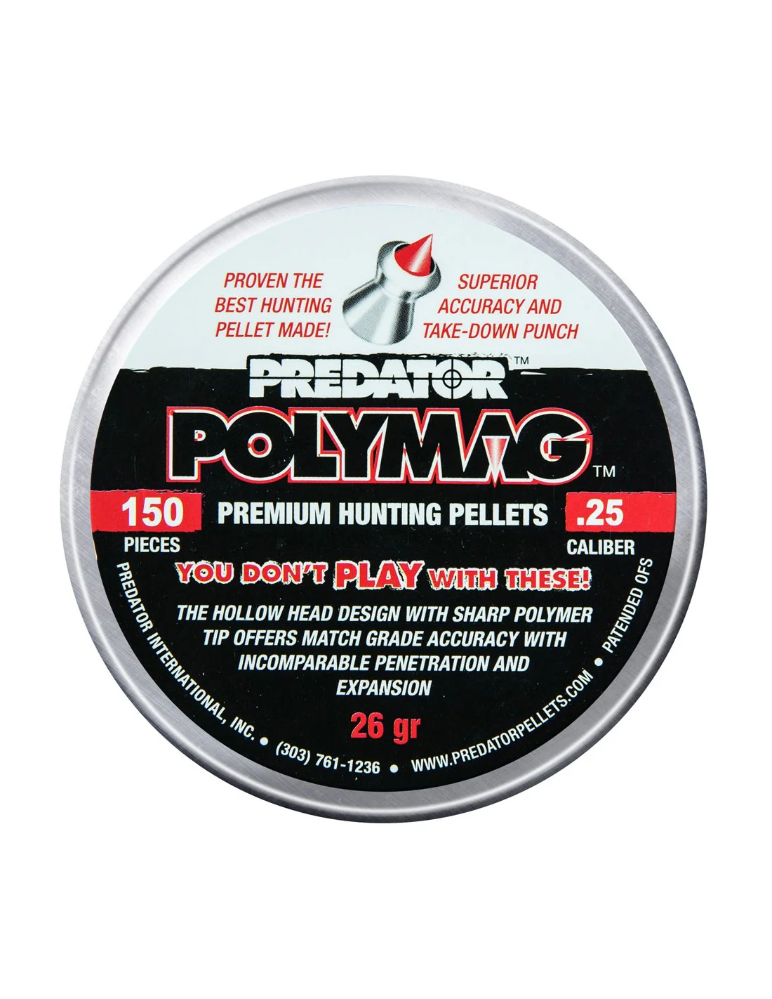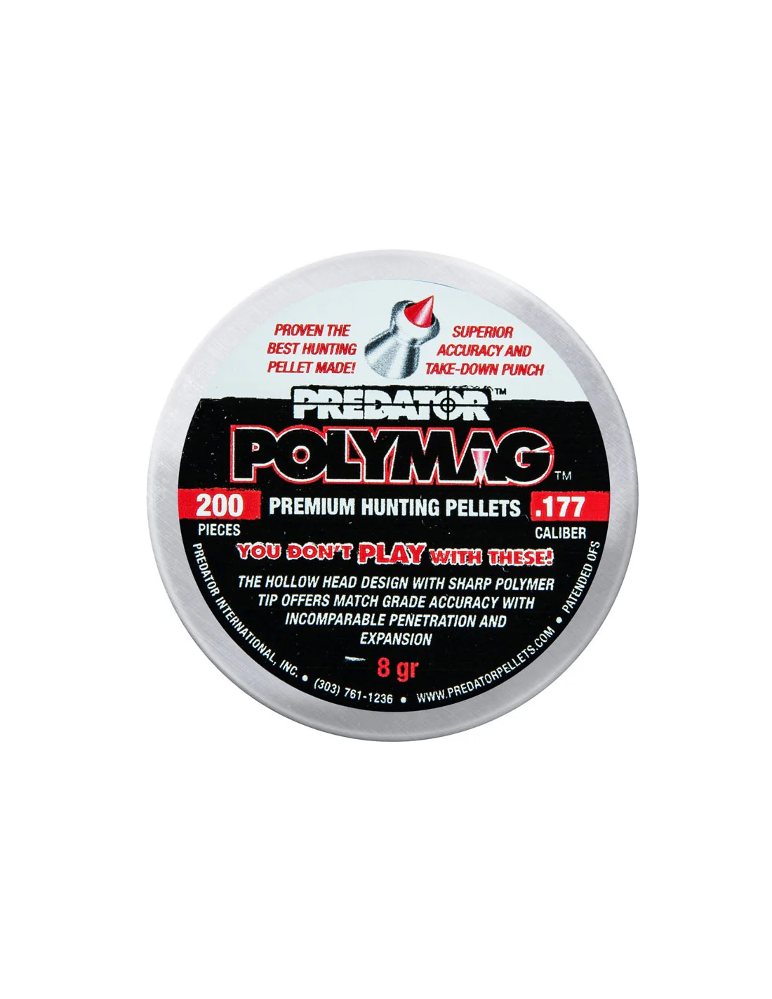 La exclusiva munición Predator Polymag es fabricada por nuestra empresa en colaboración con un colaborador de Estados Unidos que posee la patente de este tipo de proyectil. Se trata de un balín de plomo en el que se presiona una punta de polímero.