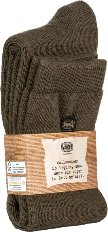 Tan cómodos que puedes dejártelos puestos hasta en la cama. Los calcetines de lana originales de MAUSER se fabrican según normas militares, son cómodos de llevar y te mantienen totalmente abrigado. Los pies fríos durante una cacería invernal o un largo paseo por la nieve son cosa del pasado. Y los calcetines de lana MAUSER también hacen una buena aparición durante las acogedoras veladas junto a la chimenea en casa.