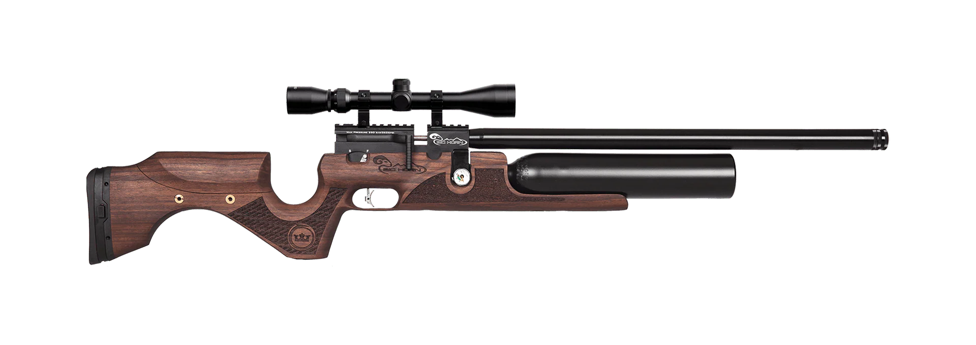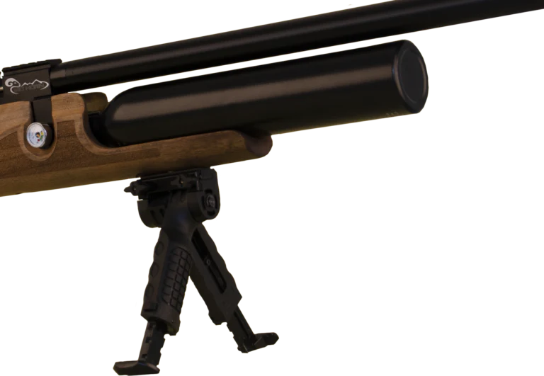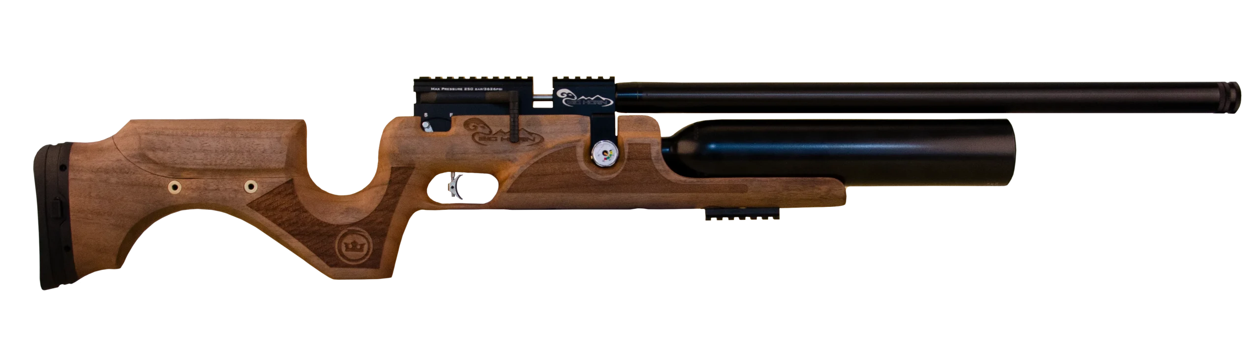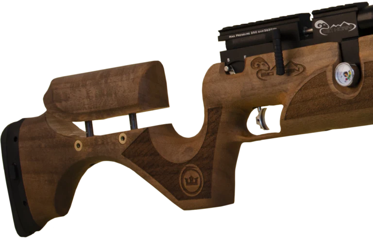 La carabina PCP Puncher Bighorn fabricada por la firma turca Kral Arms es una potente arma de calidades y acabados del más alto nivel del mercado. Esta carabina está montada sobre una culata de madera de nogal con carillera ajustable y cantonera de goma. En su mecanismo destaca su cañón largo estriado de acero con rosca para silenciador y su gatillo ajustable manual.