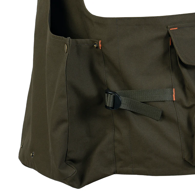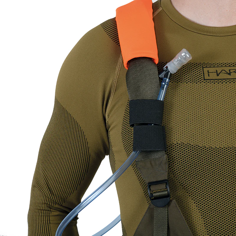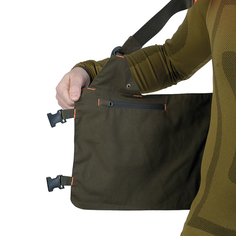 Chaleco de caza tipo arnés. Fabricado en duradero tejido de mezcla de algodón. Diseñado para transportar todo lo necesario con ligereza. Bandas reflectantes negras y pieza escamoteable naranja en espalda. Dimensionado para ser usado sobre cualquier tipo