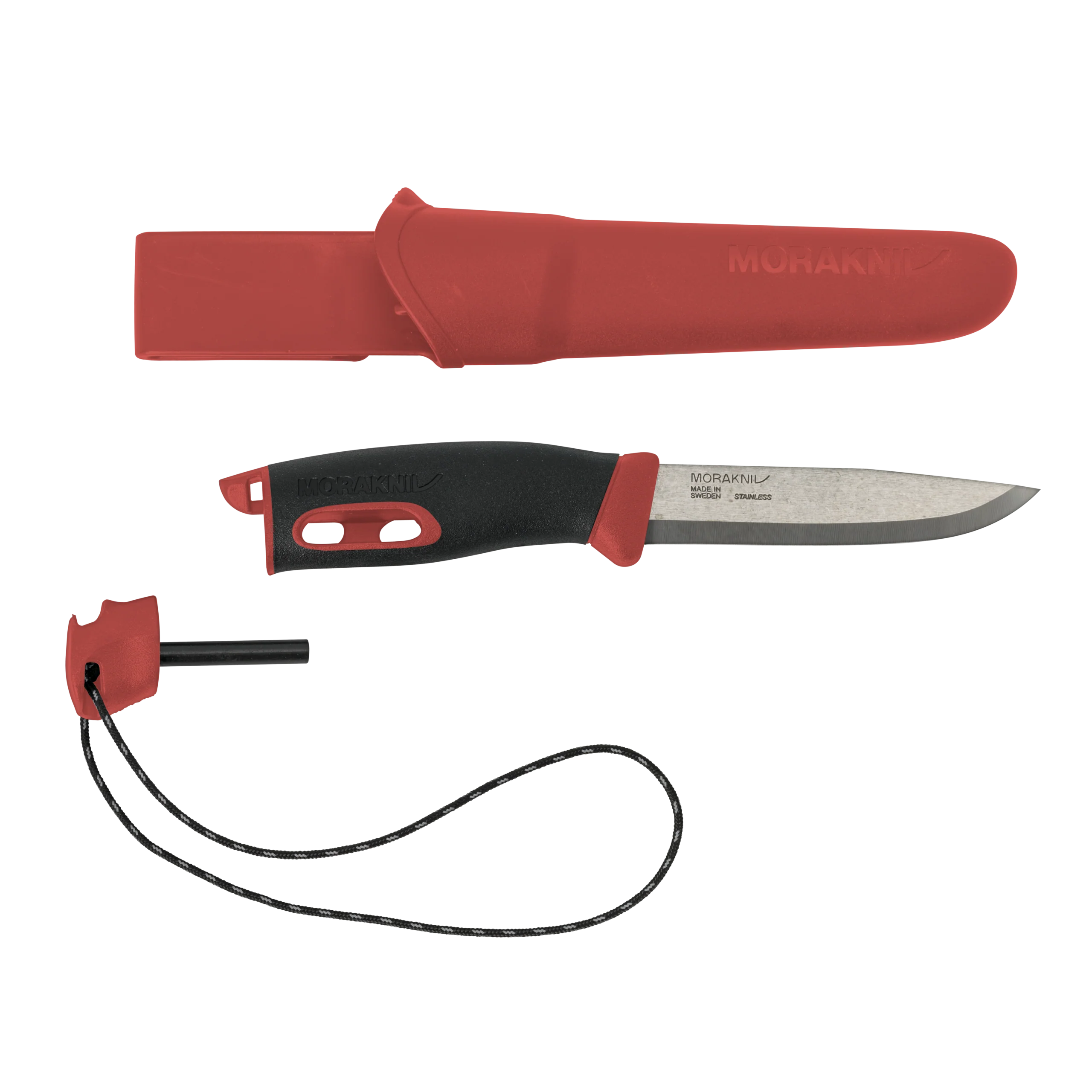 El mango ergonómico de polímero cuenta con una suave empuñadura de fricción, un robusto protector para los dedos y una hoja de 2,5 mm de grosor fabricada con acero inoxidable sueco reciclado, que proporciona resistencia y estabilidad en cada corte. Gracias al diseño de la hoja y el mango, el cuchillo es ideal para trabajar con seguridad y eficacia en diferentes condiciones climáticas durante todo el año. Cuenta con un iniciador de fuego integrado en el mango, listo para encender la hoguera. También está equipado con un paracord reflectante para reducir el riesgo de perder el iniciador del fuego. La funda del cuchillo de polímero cuenta con un práctico clip para el cinturón, de modo que el cuchillo puede sujetarse al cinturón o a la mochila, siempre a mano.