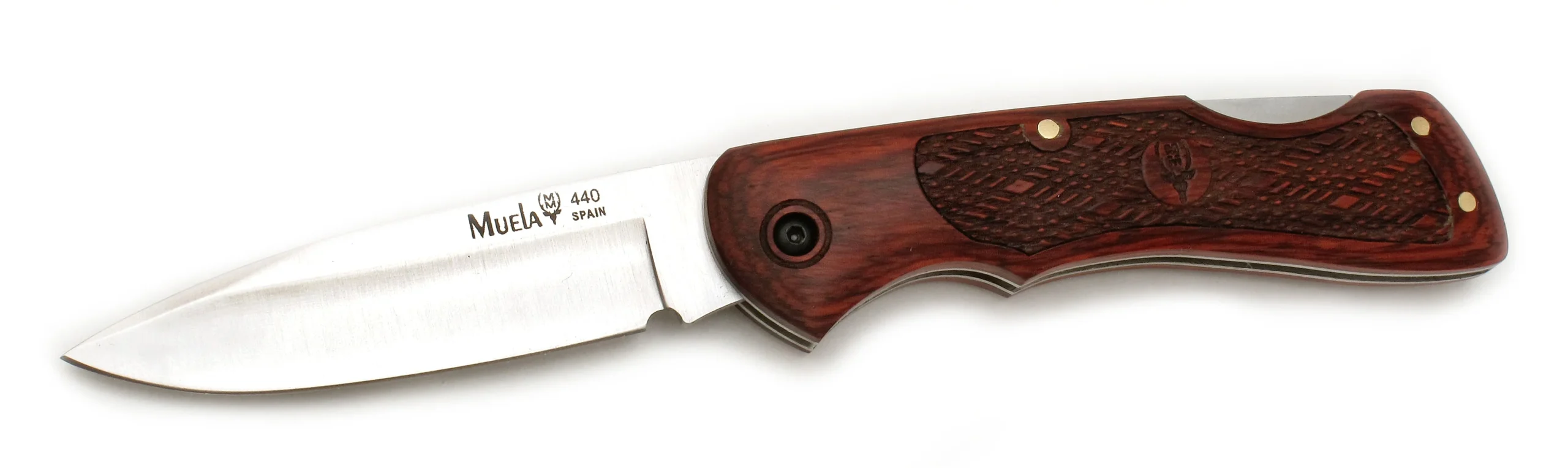 Navaja española Muela con hoja fabricada en acero inoxidable 440. Bloqueo Back Lock y cachas fabricadas en madera prensada coral tallada. Incluye funda de cordura de color negro.