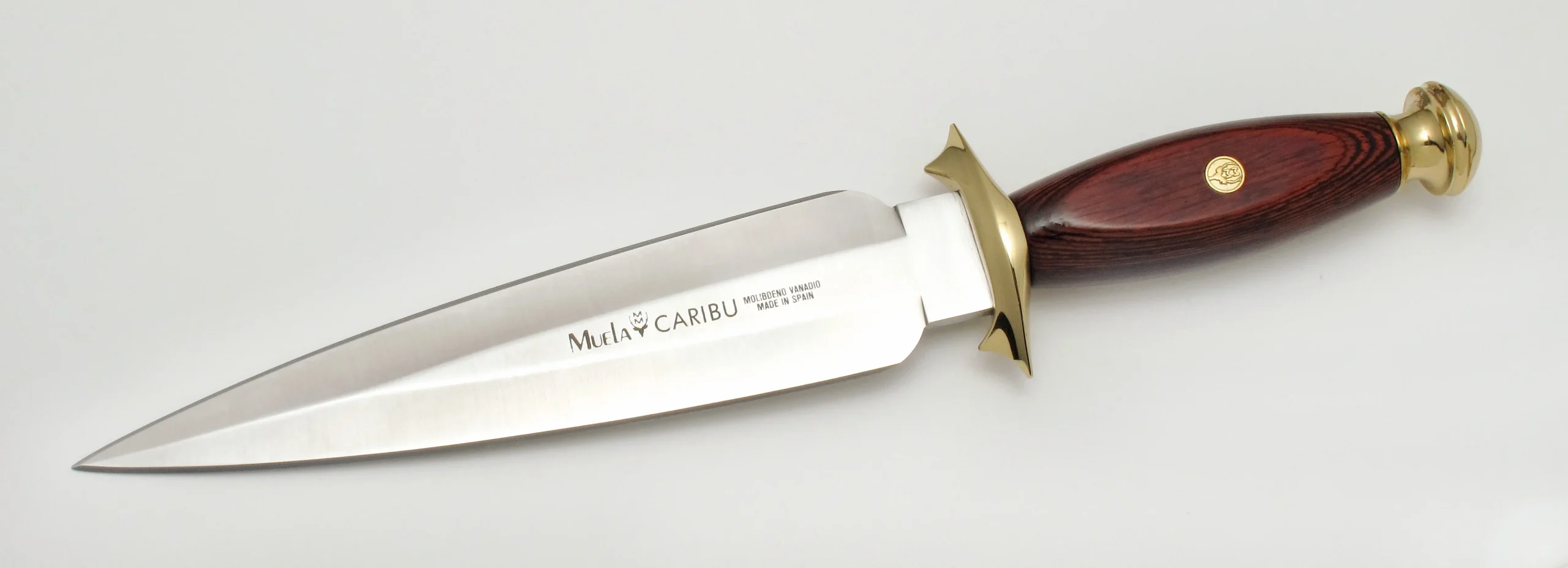 Cuchillo de caza y deportivo fabricado por la empresa española Muela modelo CARIBU, especialmente indicado para el remate y la caza. Hoja enteriza fabricada en acero MoVa (1.4116). Empuñadura fabricada enmadera prensada coral y latón. Guarda y pomo en latón. Funda de piel de color marrón.