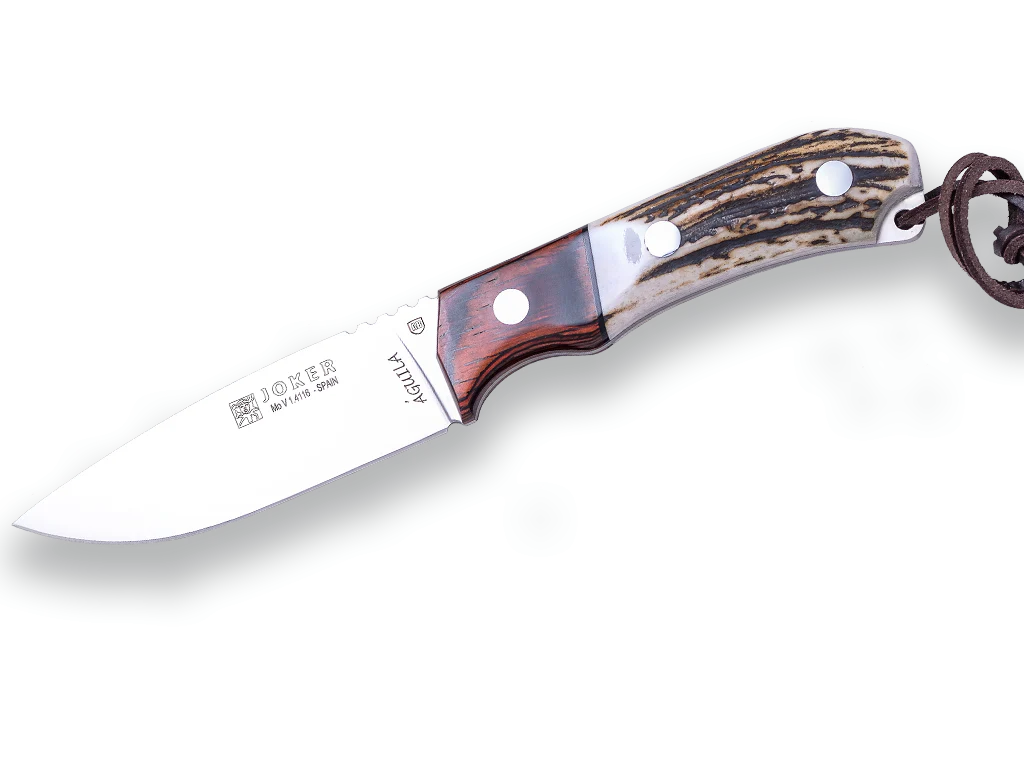 CUCHILLO DE CAZA JOKER AGUILA,PUÑO EN ASTA DE CIERVO, VIROLA STAMINA, HOJA DE 10,5 CM. FUNDA DE CUERO