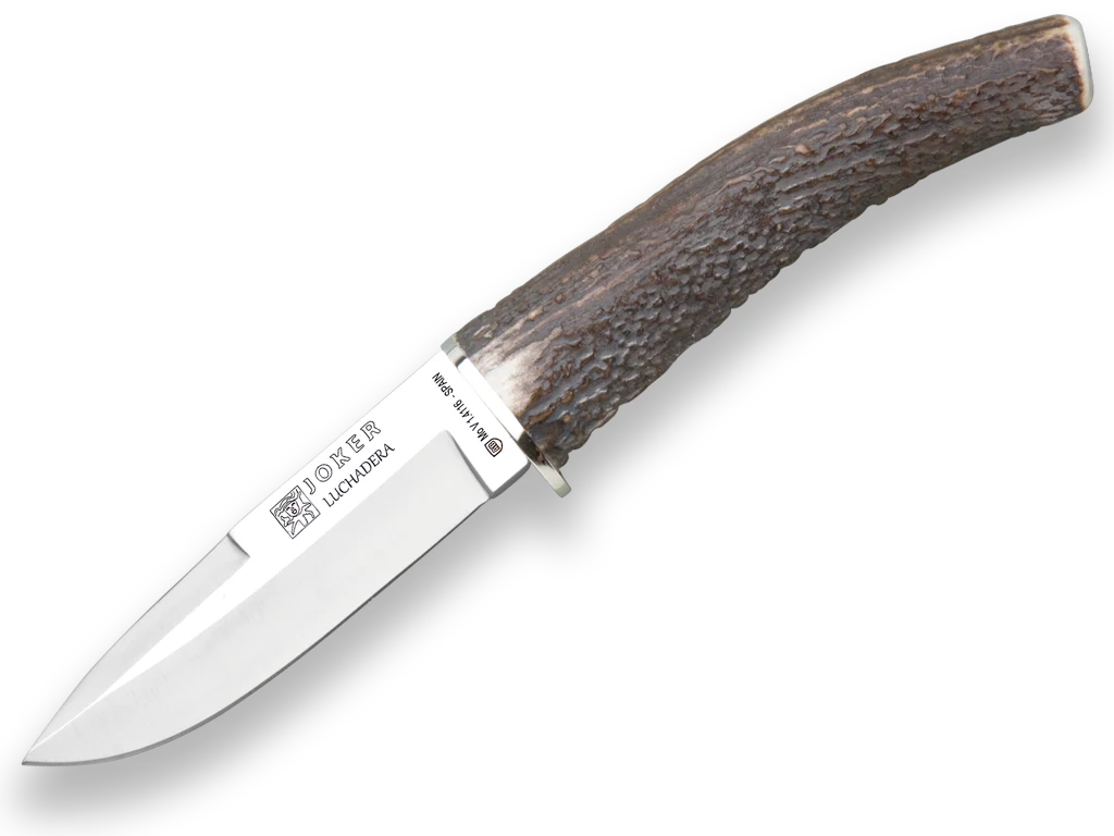 CUCHILLO DE MONTE JOKER LUCHADERA, PUÑO PUNTA ASTA CIERVO, HOJA DE 10 CM. FUNDA DE CUERO.