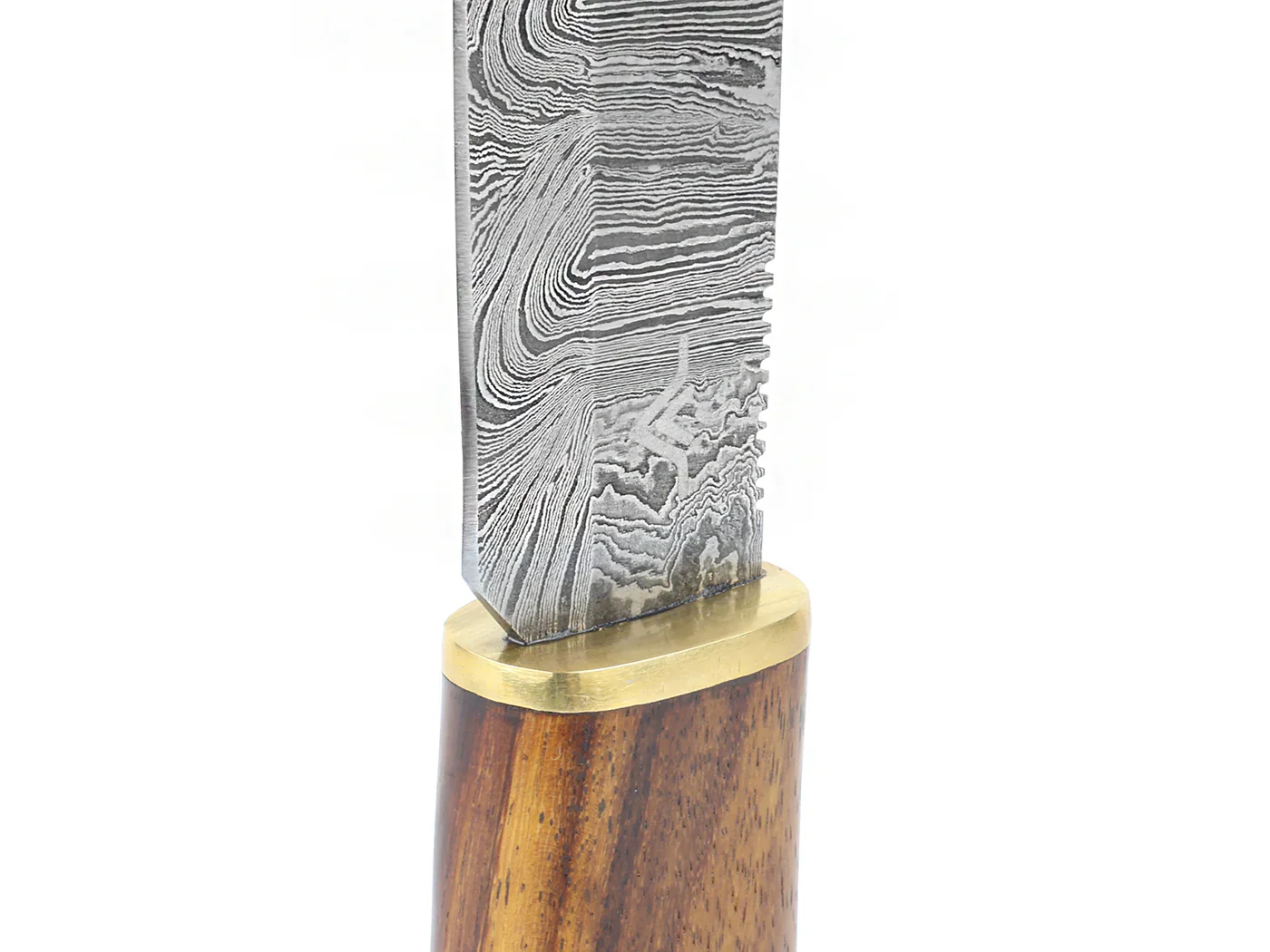 La hoja, hecha de acero de Damasco estratificado y forjado a mano, se distingue por su resistencia y su apariencia llamativa.