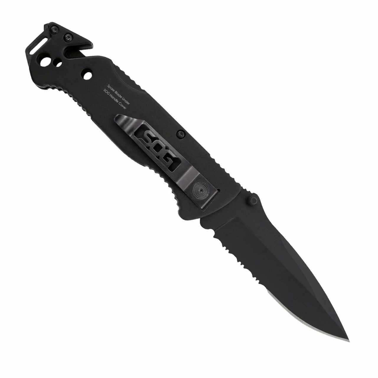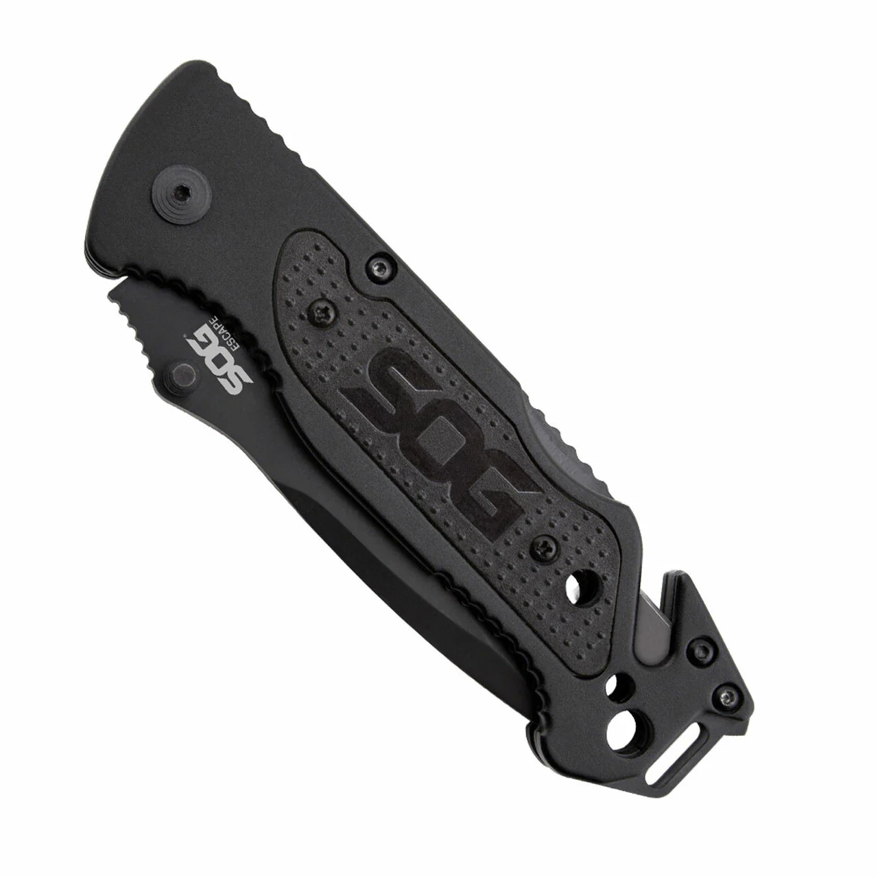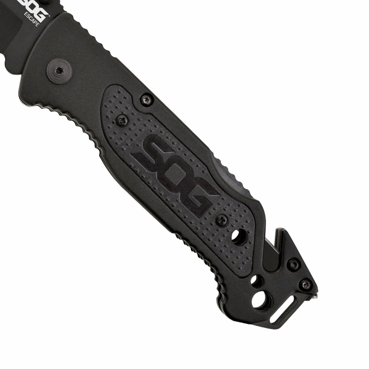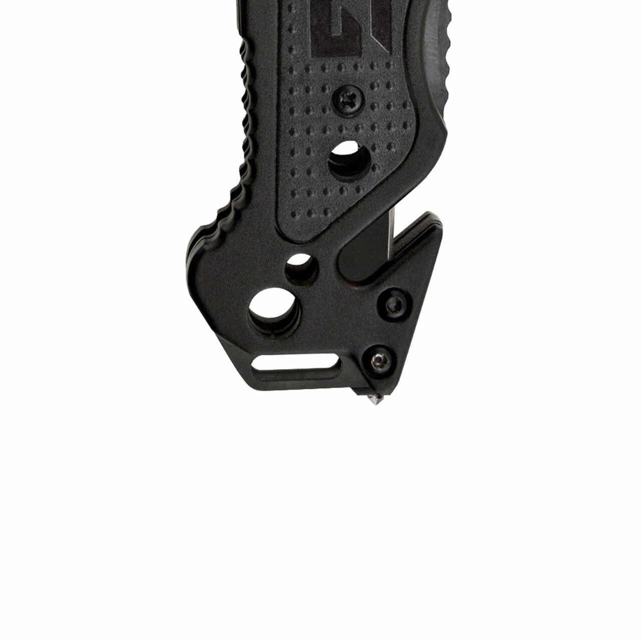 La Escape tiene el tamaño perfecto para llevarla a diario, pero sigue teniendo una enorme capacidad con su hoja de apertura con una sola mano. Integrado en el mango hay un cortador de líneas (perfecto para cortar cordones, cuerdas, cinturones de seguridad, etc.), un rompe cristales para emergencias extremas, nuestro pelacables pendiente de patente, y hojas de cortador de líneas extra (que se guardan bajo la losa del mango). Todo esto combinado con una robusta hoja de punta de lanza parcialmente dentada y un mango de aluminio anodizado duro, dice que estoy preparado para lo que pueda venir.