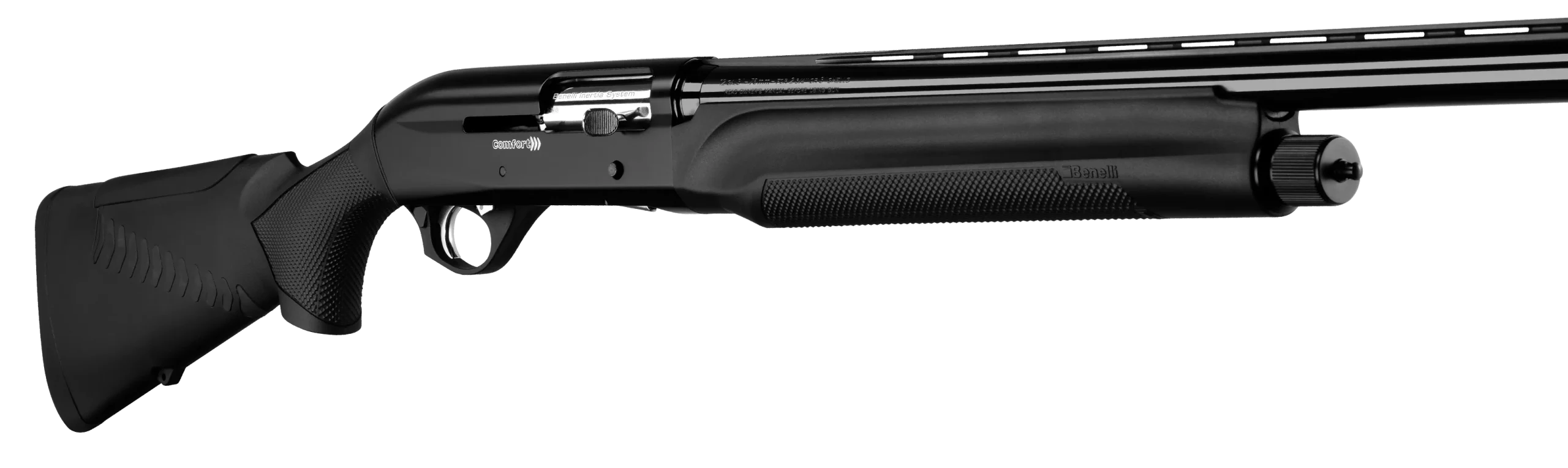Modelo BENELLI MONTEFELTRO CONFORT, disponible en calibre 12 (3 Kg.) y calibre 20 (2,65 Kg.), disponible con culata y delantera de material sintético negro y sistema Comfortech, bascula y cañón negro brillante, gatillo plateado, es la versión Sintética del modelo Montefeltro tradicional.