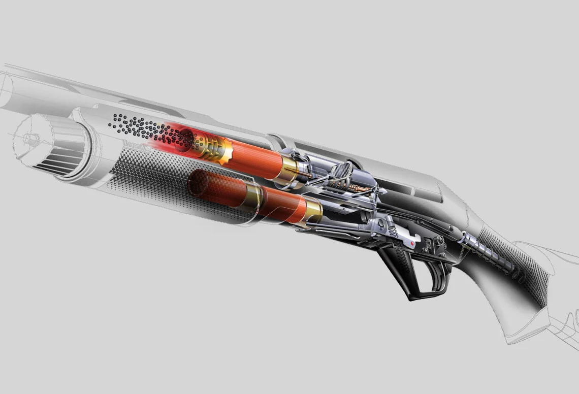 - Sistema semiautomàtico inercia Benelli con grupo de disparo de geometría variable.