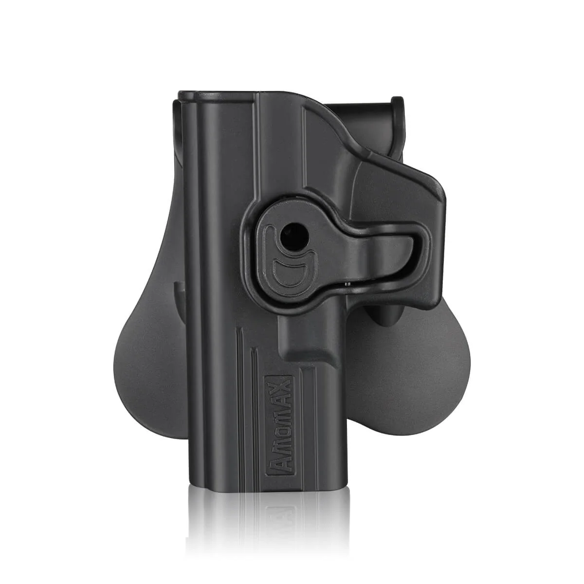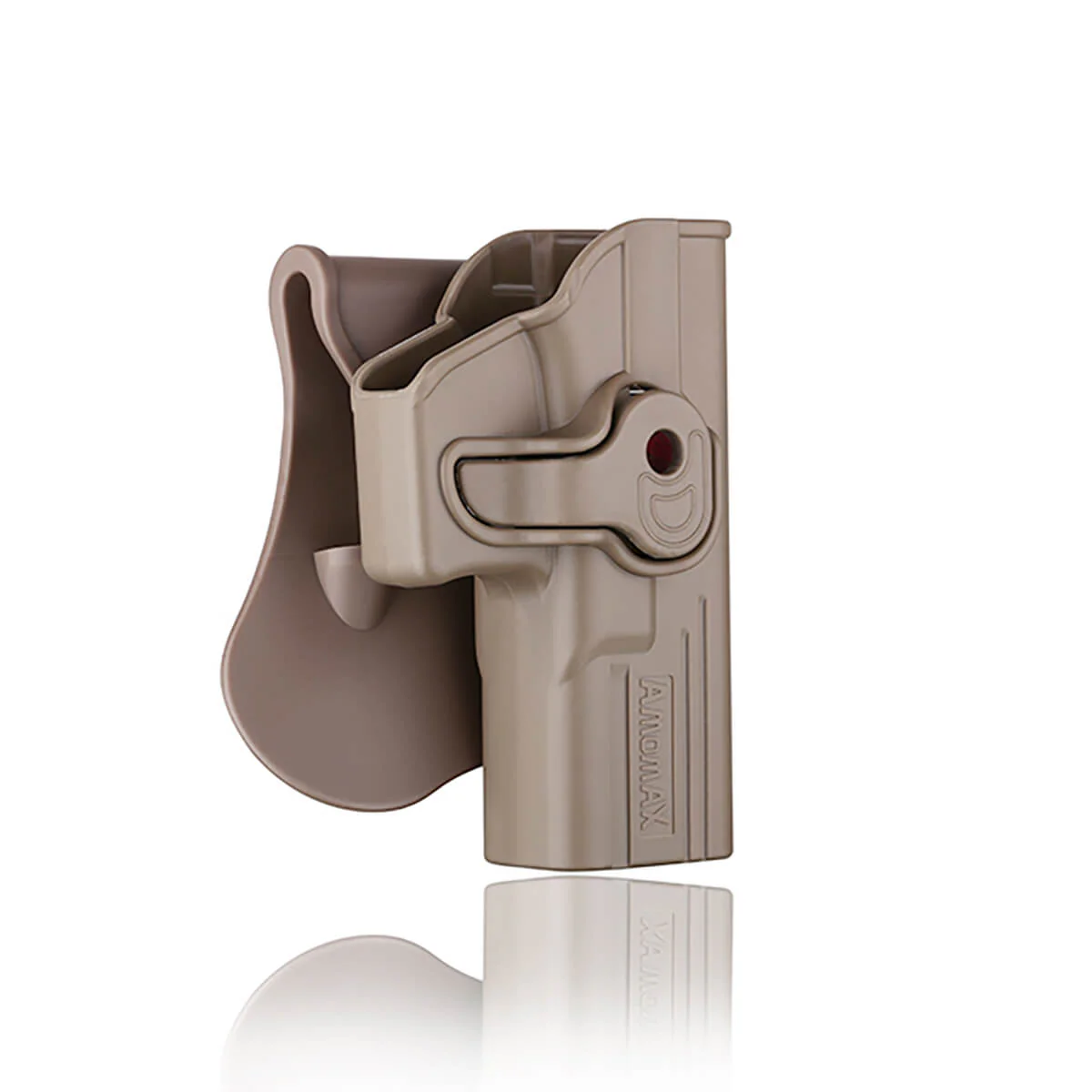 La funda Amomax es compatible con 4 plataformas de transporte diferentes: paleta (estándar), clip de cinturón, MOLLE y plataforma de pierna caída.