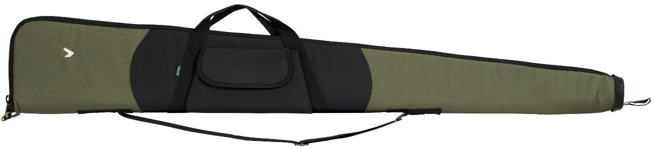 Funda de 130cm de largo, con asa de transporte y correa. Color negro y verde con el logo de Gamo.