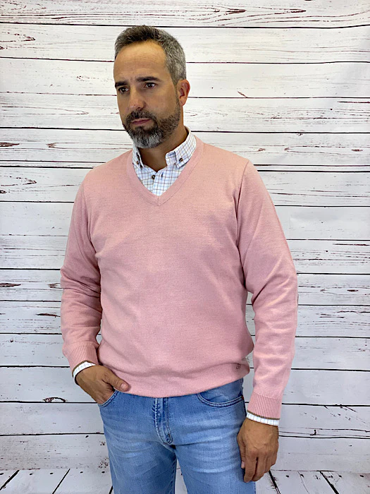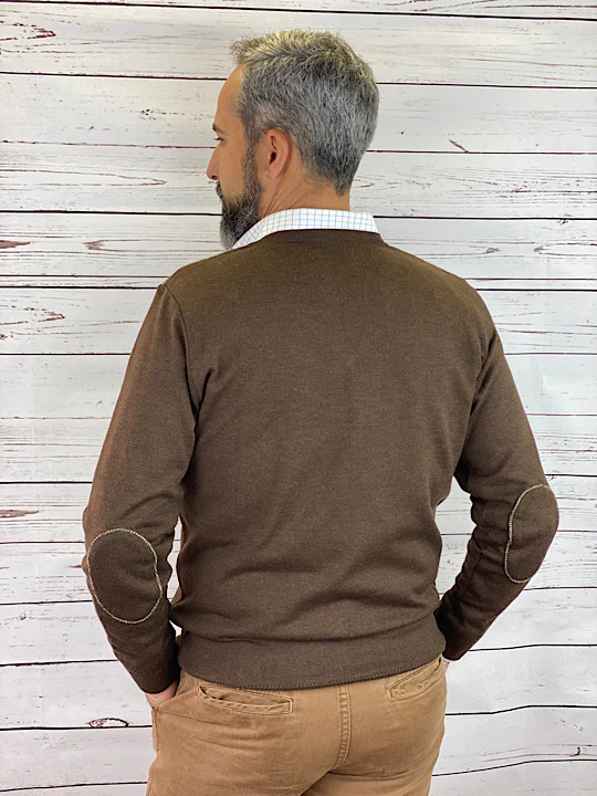 Jersey básico cuello pico, con detalles de tweed en hombros y coderas, logotipo bordado en pecho. Tejido 50% lana 50% acrílico.