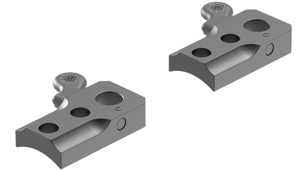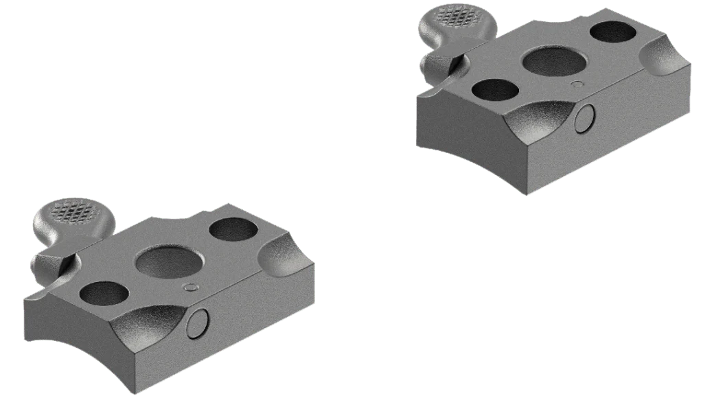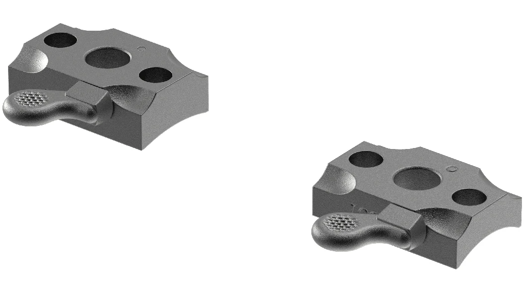 Las monturas QR se desmontan y montan rápidamente. Se gira la palanca hacia adelante y una excéntrica en el eje de la palanca engancha la base del anillo, tirando de ella hacia abajo y hacia adelante en la base, asegurándola sólidamente en su posición «cero».