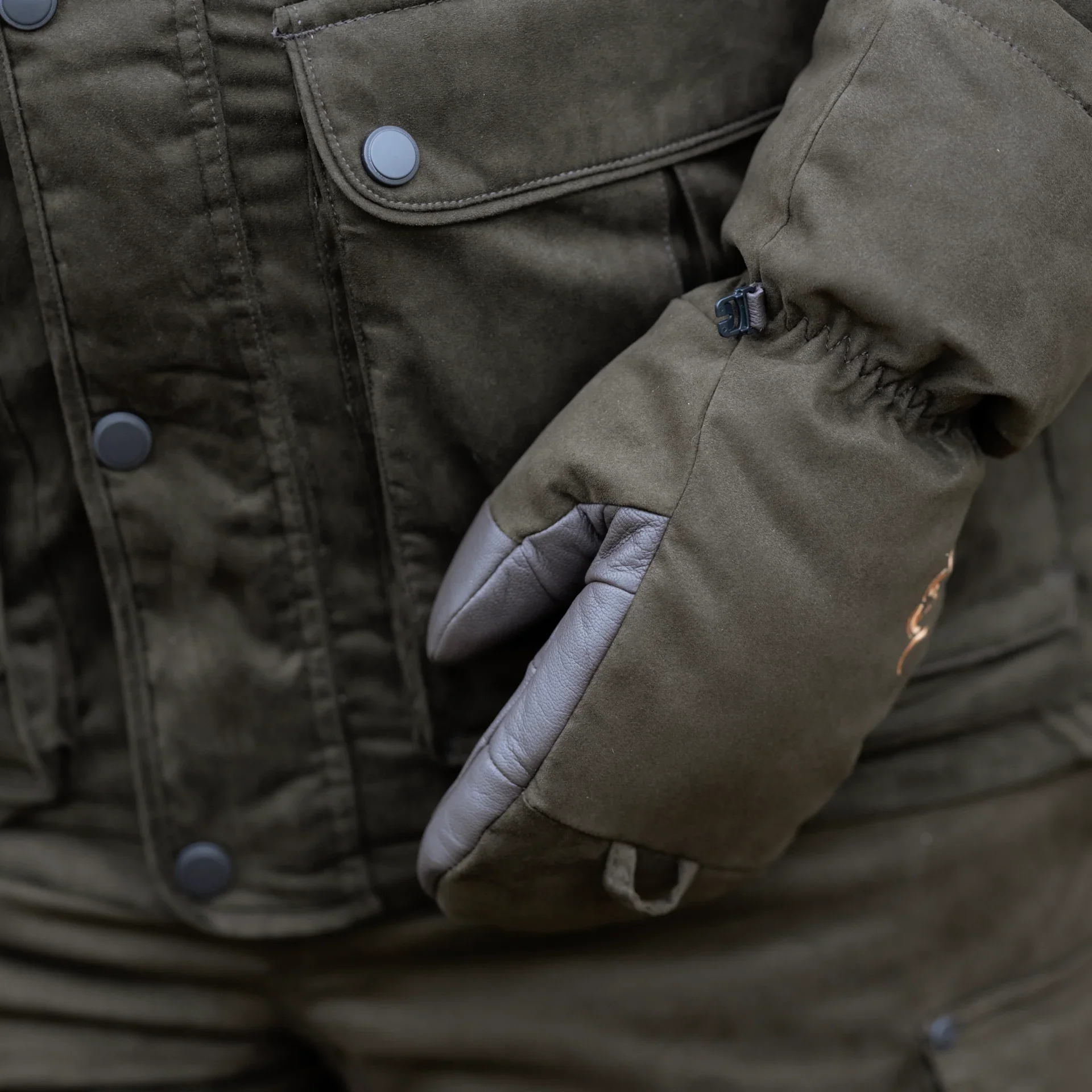 Manopla de ante hecha con 300 g de aislamiento Primaloft®, parte posterior de la mano hecha de gamuza e interior de la palma hecha de cuero de piel de cabra, pulgar preformado, cierre elástico de muñeca y puño, lazos para colgar para poner y quitar rápidamente las manoplas si es necesario.