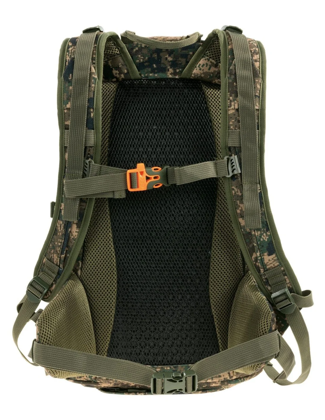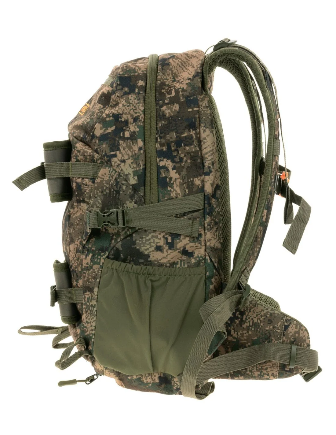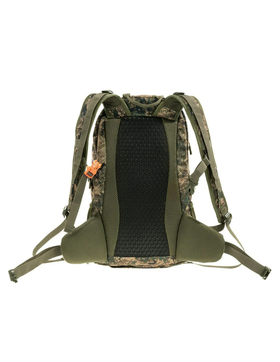Tejido de politricot cepillado resistente al agua. Diseño compacto para llevar lo necesario en un día de caza. Acolchado trasero ventilado preformado de malla y EVA, correas ajustables para los hombros y acolchado ergonómico para la cadera. La malla con EVA ayuda a que la mochila se separe del cuerpo y maximiza el flujo de aire por la espalda para reducir la transpiración.