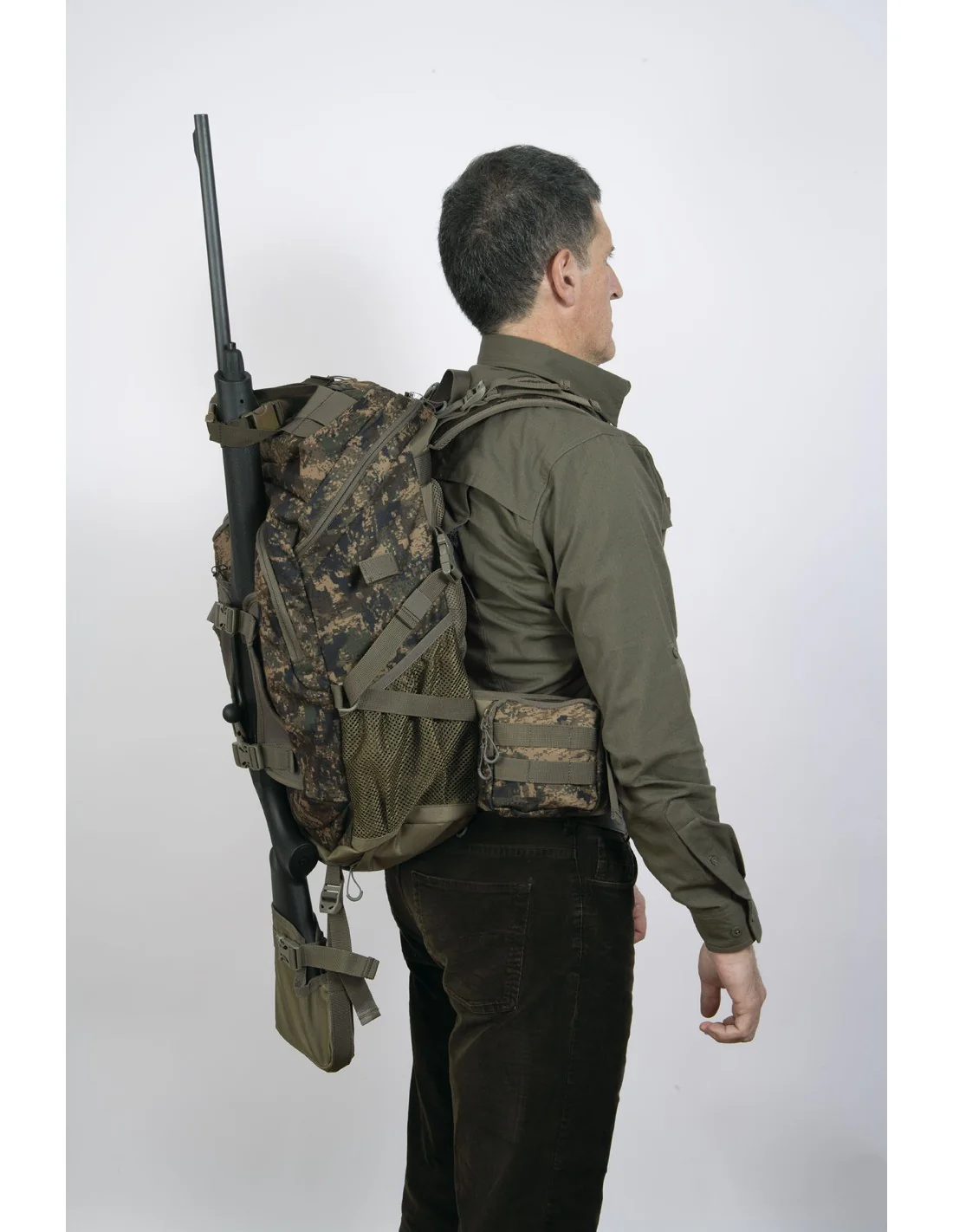 Mochila de caza técnica y silenciosa, confeccionada en tejido politricot cepillado resistente al agua. Sistema de acolchado en la espalda con piezas de malla transpirable colocadas anatómicamente para mejorar el confort y la ventilación. Altura regulable mediante tirantes, correa ajustable deslizante para el pecho con silbato de emergencia y brújula, y cinturón con ceñidores.