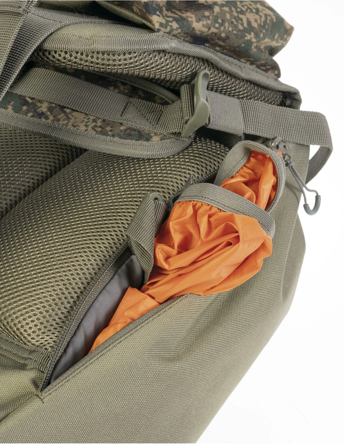 Tres niveles de bolsillos con cremallera en la parte delantera ofrecen una progresión en el espacio de almacenamiento disponible. El bolsillo intermedio cuenta con bolsillo de malla con capacidad para una caja de munición y un porta-balas desmontable con velcro que funciona también en los sistemas de almacenamiento de varias de nuestras chaquetas. Un bolsillo con cremallera, una franja en molle y correas ajustables colocadas sobre la tapa de cierre permiten aumentar la gran capacidad de carga en el bolsillo más grande situado cerca de la espalda.