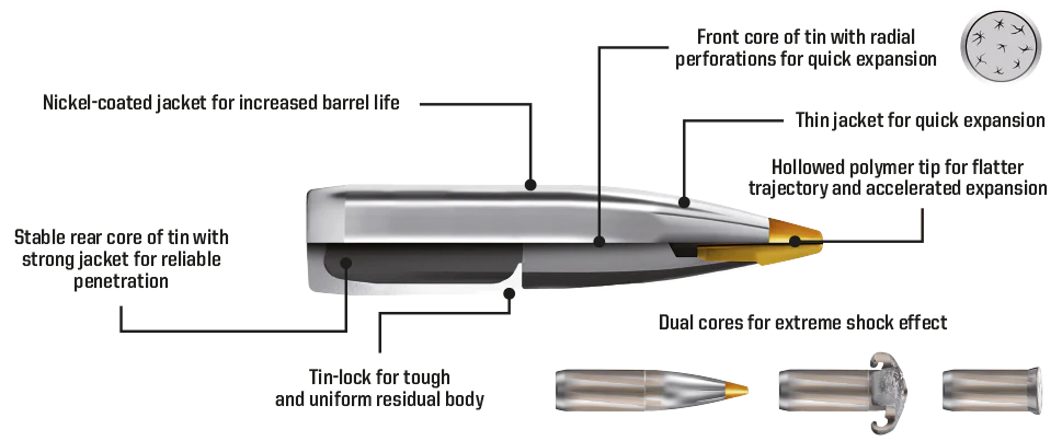 La parte delantera de la bala está diseñada con perforaciones radiales para una rápida expansión tras el impacto. La parte trasera de la bala es una pieza de núcleo sólido que penetra hueso, piel y otros obstáculos duros en el camino.