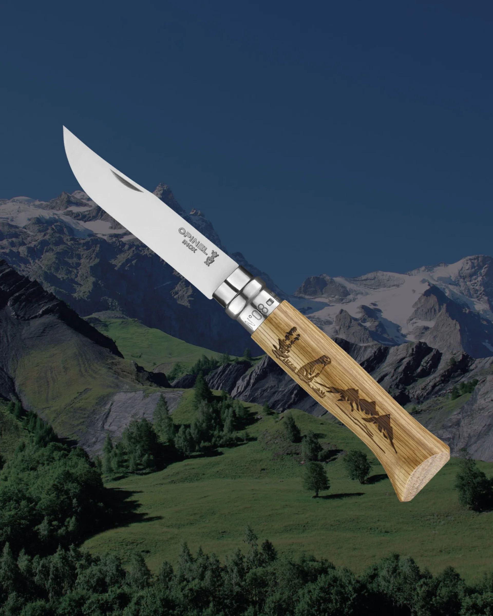 Los desarrolladores franceses de Opinel han desarrollado una hoja de acero con estilo Bowie, que forma una punta muy fina, ideal para la perforación de objetos o texturas. Además, este perfil de cuchillo permite aumentar el control y la fuerza por parte del usuario.