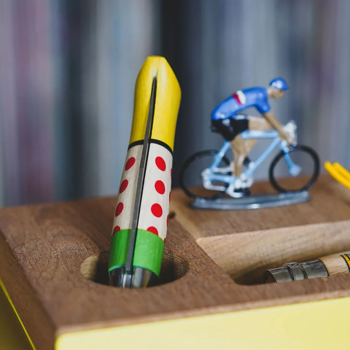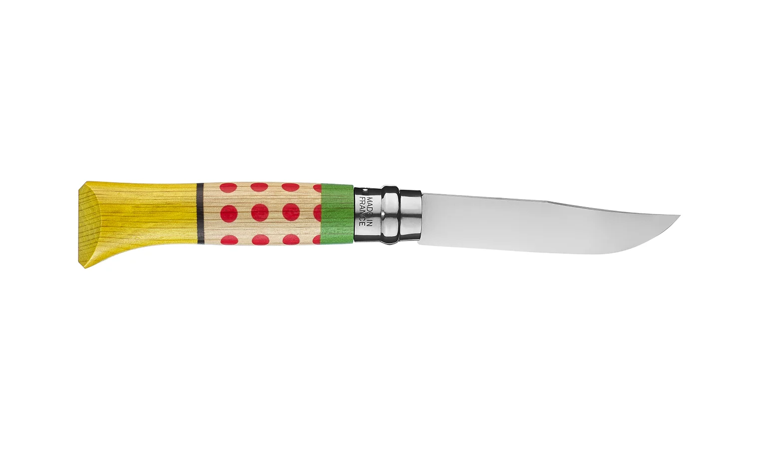 La navaja Opinel VRI N°8 cuenta con un mango de madera de carpe claro, decorado con motivos gráficos mediante impresión por sublimación: áreas o puntos, cuyos colores se inspiran en los maillots de los mejores participantes del Tour de Francia. Gracias a la colaboración con el nuevo diseñador Matthieu Lifschitz, bajo el nombre de Manivelle, Opinel ha retomado la idea original de 2017, cuando lanzó navajas con los colores de los famosos maillots del Tour. En la navaja diseñada para el Tour de Francia 2022, encontrará el amarillo, en honor al maillot del competidor más rápido, el danés Jonas Vingegaard de ese año. Una franja verde para el mejor velocista, el belga Wout van Aert en 2022. El toque divertido son los lunares rojos, inspirados en el maillot del mejor alpinista, Jonas Vingegaard, una vez más.