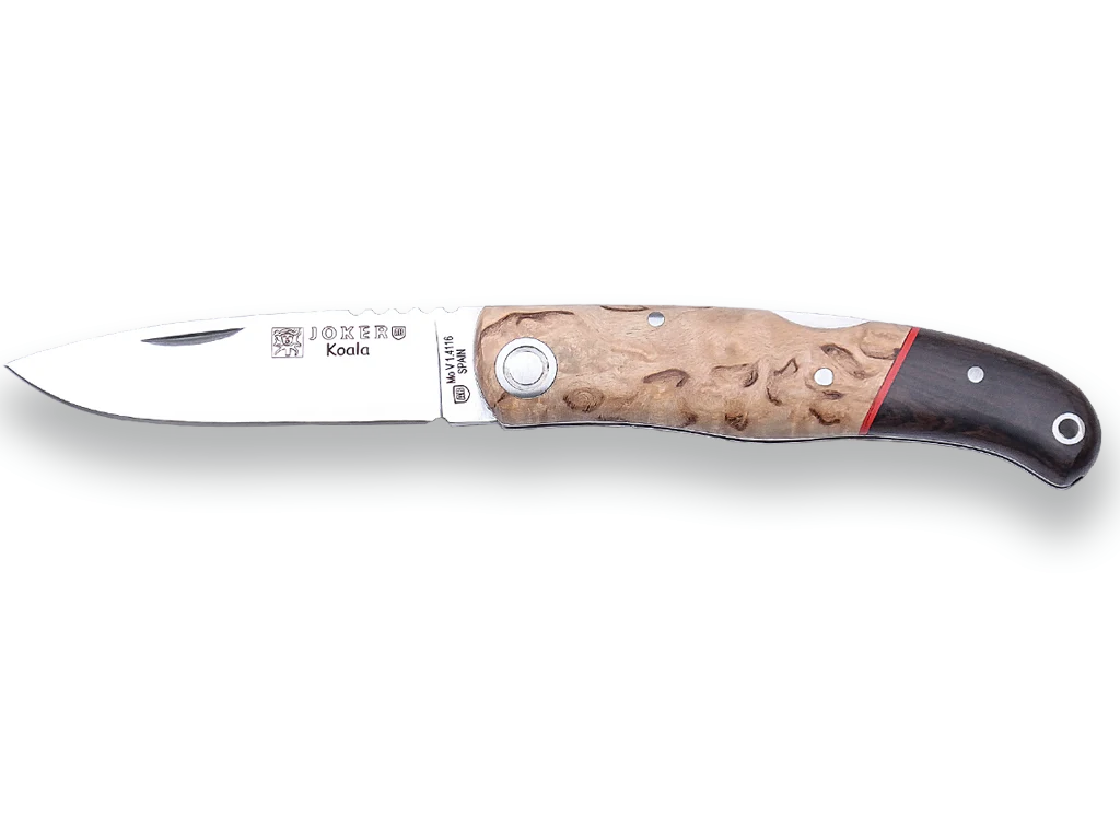 Navaja deportiva Joker, con cachas de abedul rizado, virola en madera granadillo y hoja de 7 cm de Acero MOVA, 57 gr, NL124 con las siguientes características: