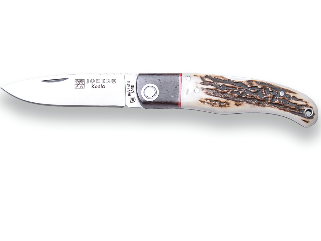Navaja deportiva con bloqueo Joker «Koala» NC124, cachas en asta de ciervo, virola de granadillo, hoja de 7 cm MOVA, herramienta de pesca, caza, camping y senderismo con las siguientes características: