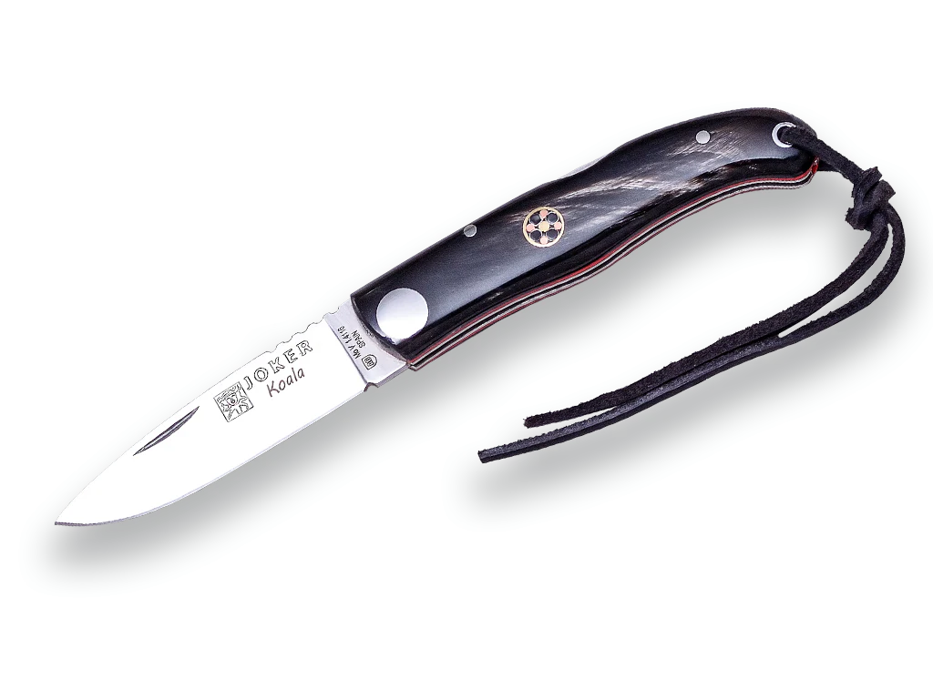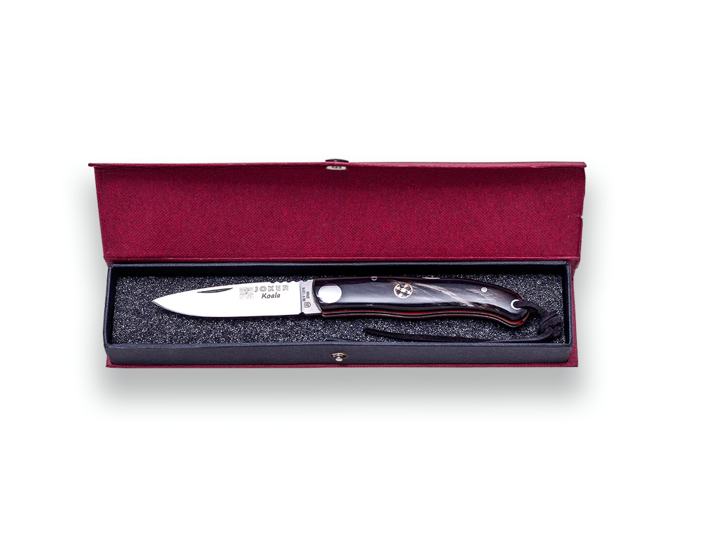 Navaja deportiva Joker «Koala» NF124, con bloqueo trasero, hoja MOVA 1.4116 de 7 cm, cachas cuerno de búfalo, incluye estuche, herramienta de pesca, caza, camping y senderismo con las siguientes características: