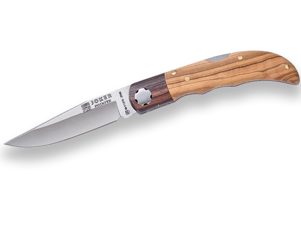 Navaja Joker «Pointer» NO118 deportiva de bolsillo con cachas de olivo y virola palisandro, hoja 8 cm, herramienta de pesca, caza, camping y senderismo con las siguientes características: