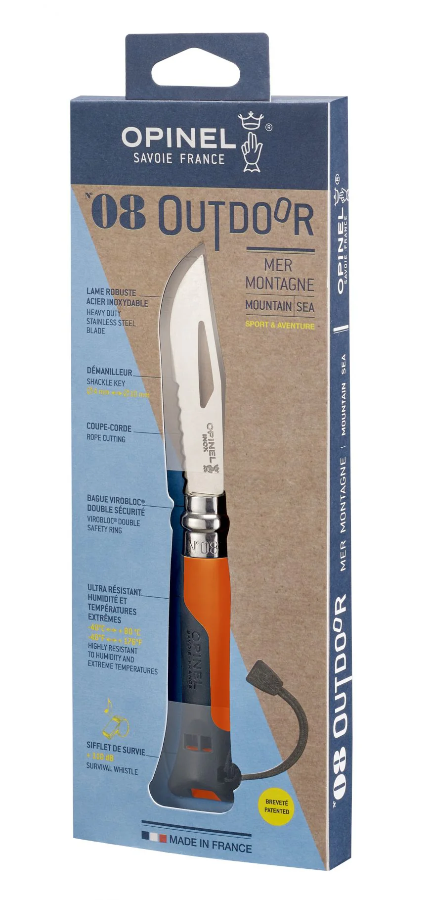 Este Nº 08 tiene una hoja de acero inoxidable de 2,5 mm de grosor, una zona dentada de 3,5 cm, ofrece un alto rendimiento para cortar sin arrancar las cuerdas naturales o sintéticas y un desgrilletador para los grilletes de 4 a 10 mm. El mango es resistente al agua, a los impactos y a las temperaturas extremas. Tiene un silbato con un alcance de 300 m.