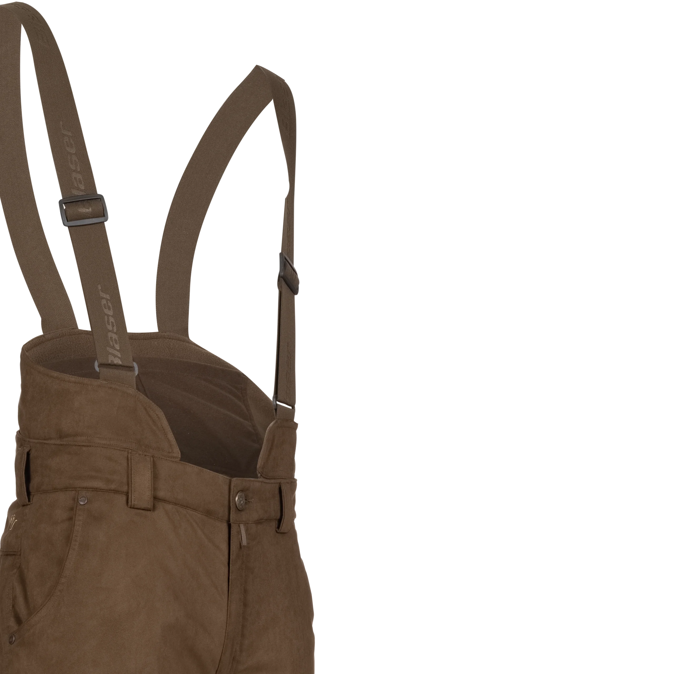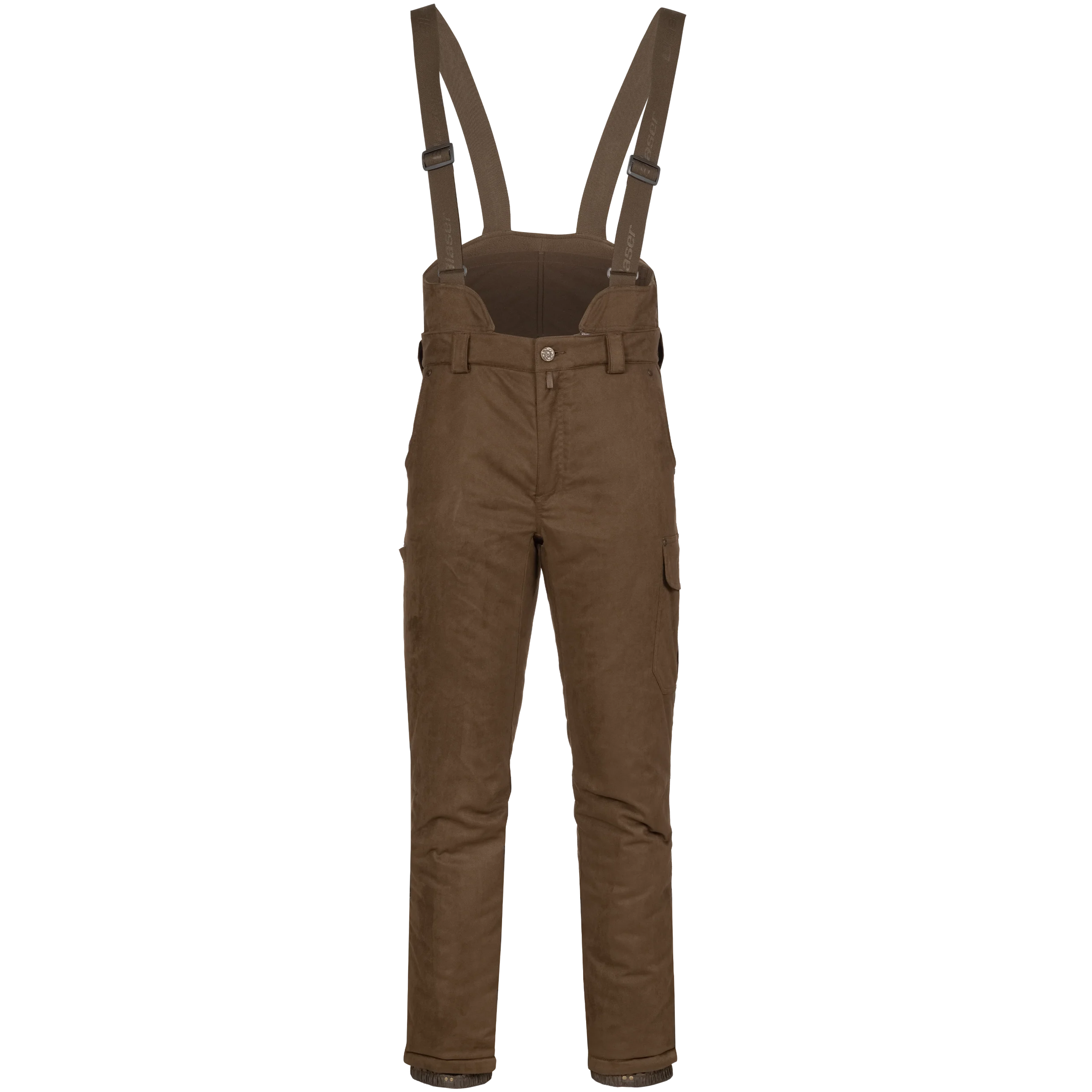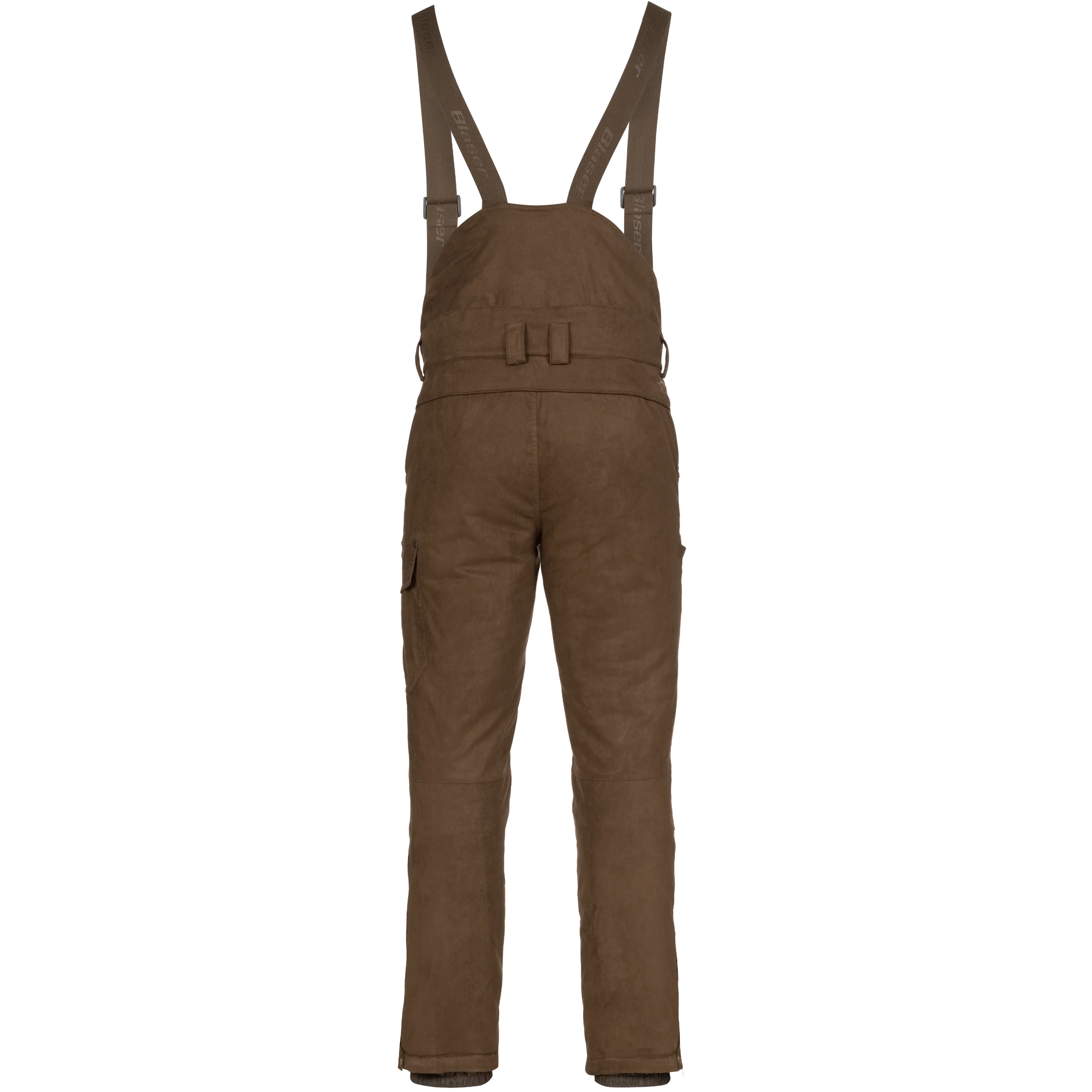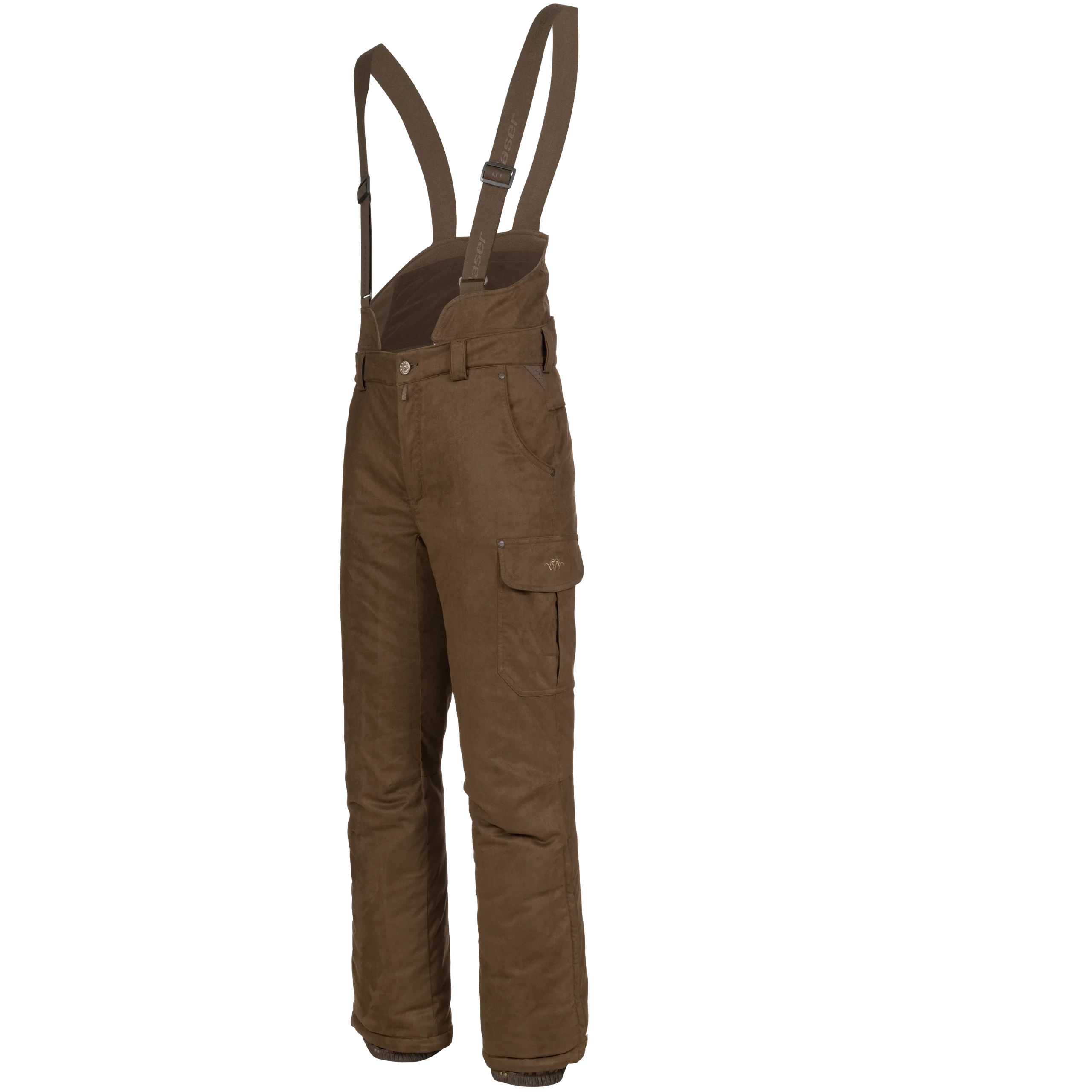 Pantalones de babero de ante de invierno para condiciones frías, construcción de forro Z impermeable, acolchado Primaloft® de 200 g, forro polar en la parte superior delantera y trasera, babero extraíble con tirantes ajustables y 2 bolsillos para elementos calefactores portátiles sobre la zona renal, trabillas para el cinturón, 2 bolsillos superiores para calentar las manos, 1 bolsillo lateral, 1 bolsillo para cuchillo, ajuste del dobladillo inferior.