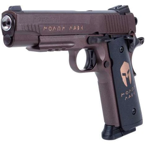 Sig Sauer ha diseñado esta pistola 1911 Spartan como una réplica exacta de la original y legendaria 1911. Cuenta con un diseño en full metal marrón y con grabados en griego tanto en el cañón como en las cachas. Esta pistola semiautomática se acciona mediante bombonas de Co2 de 12 gramos situadas en la culata.