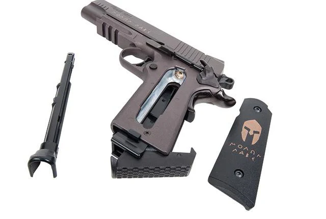 La 1911 Spartan cuenta con una corredera Blowback en marrón para que adquiera mayor realismo, y un cañón liso de acero que garantiza un disparo preciso y certero a una velocidad de 125 m/s. Además, lleva grabada la frase griega «ΜΟΛΩΝ ΛΑΒΕ», en recuerdo de la batalla de Thermopylae en el 480 AC.