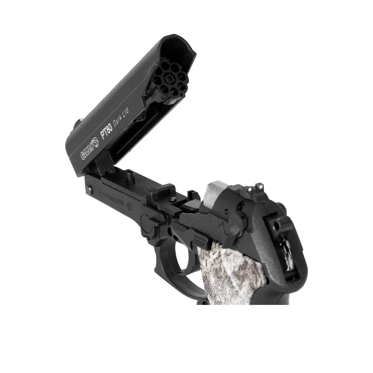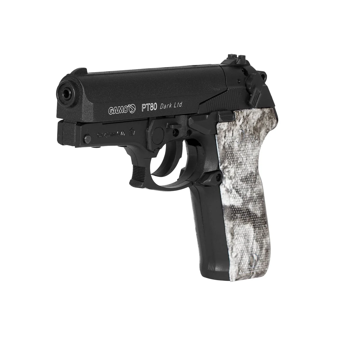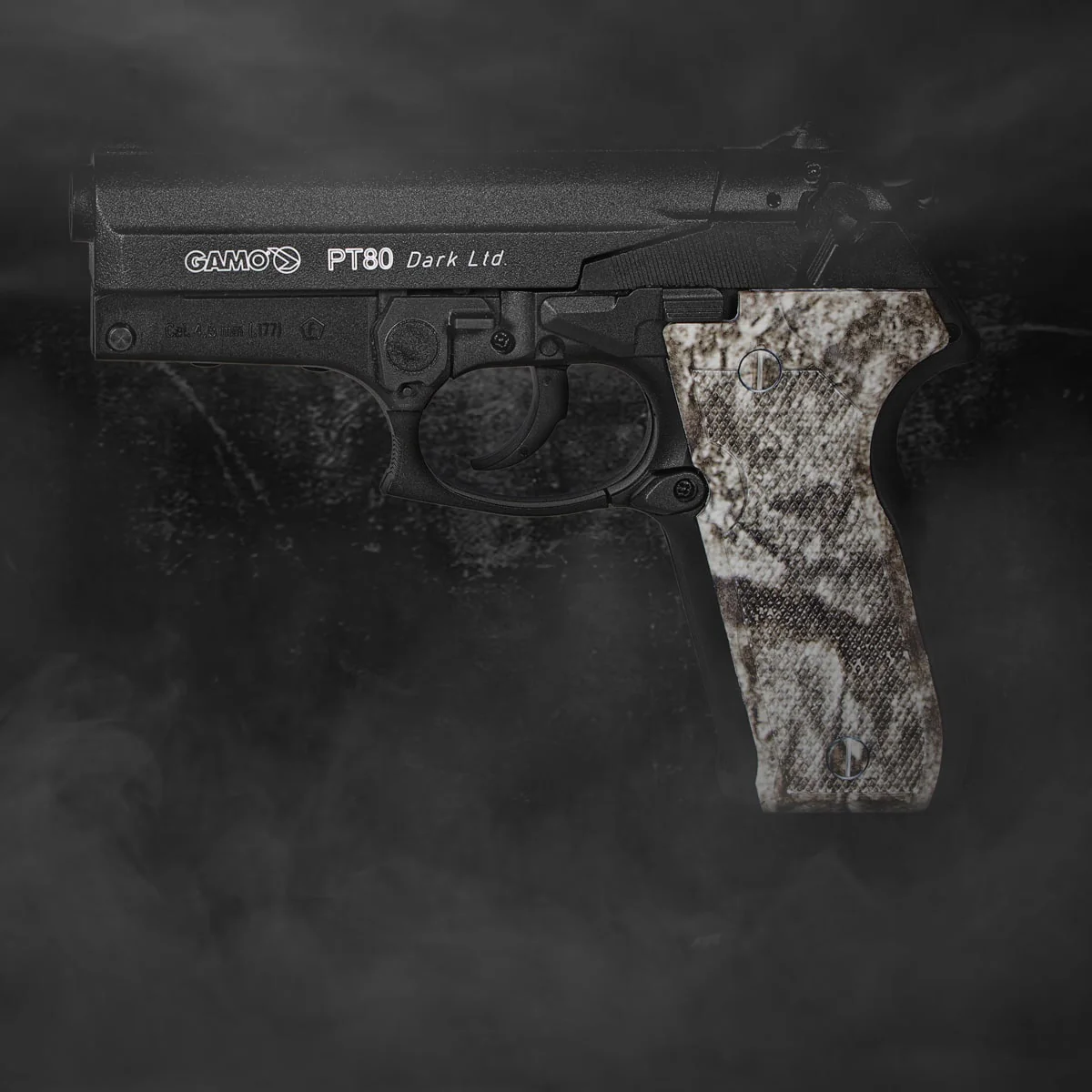 PT-80 Dark Limited Edition, un nuevo miembro de la línea PT-80. La PT-80 Dark de Gamo es el modelo perfecto para aquellos usuarios que no quieren elegir entre acción simple o doble. La PT-80 es sin duda una excelente pistola que presenta un nuevo diseño con un elegante patrón de mármol.