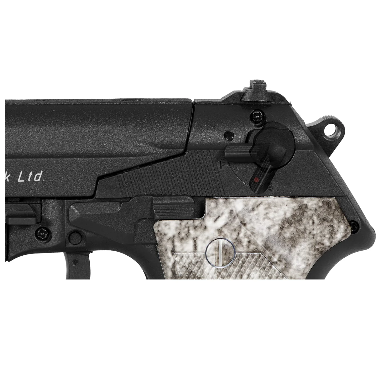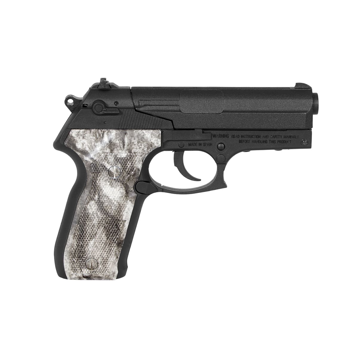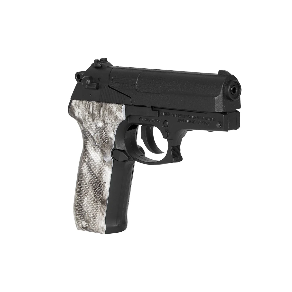 La PT-80 es una de las mejores pistolas fabricadas por Gamo. Diseñada, desarrollada y fabricada en Barcelona, España. Ahora disponible en una edición limitada de 500 unidades. Se incluye una empuñadura única de camuflaje blanco, 2 cargadores y una funda acolchada. El cargador de clip giratorio puede disparar 8 balines en 1,6 segundos.