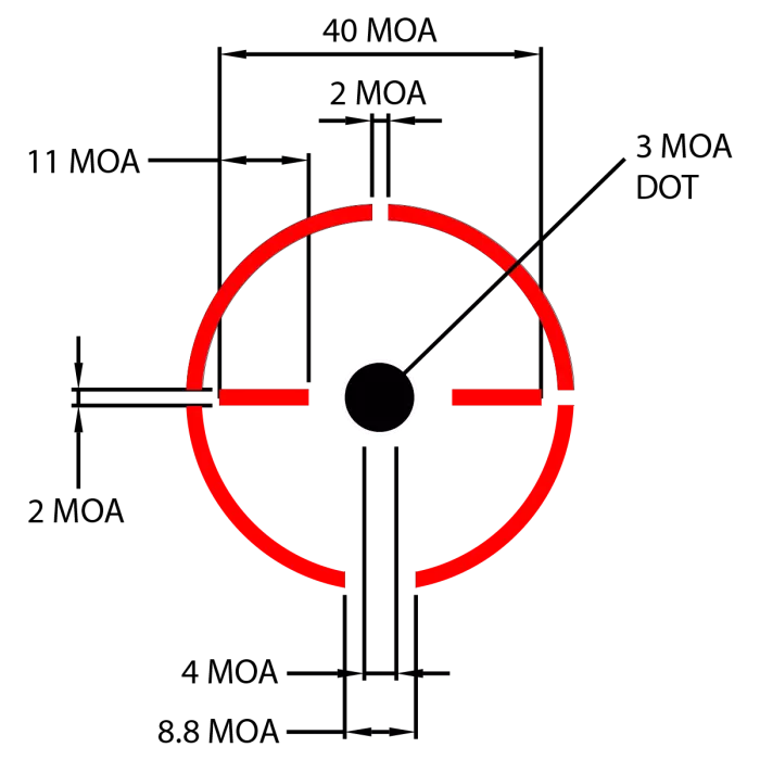 - 3 MOA y Círculo con Alas: La fina es un buen compromiso para disparar de cerca a distancias medias. El círculo y las alas atraen de forma natural la mirada hacia el punto y el blanco para una adquisición más rápida.