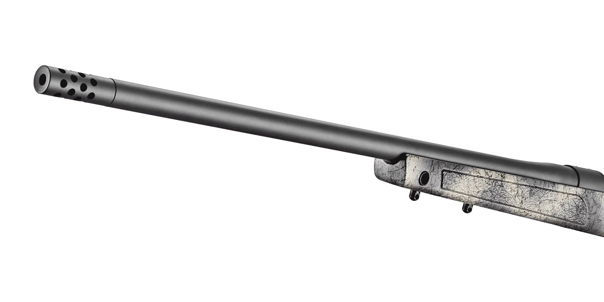 El cañón de acero Bergara 4140 CrMo tiene un acabado Sniper Grey Cerakote®. El hocico está roscado e incluye un freno de Omni Bergara. ( 5/8-24 UNEF )