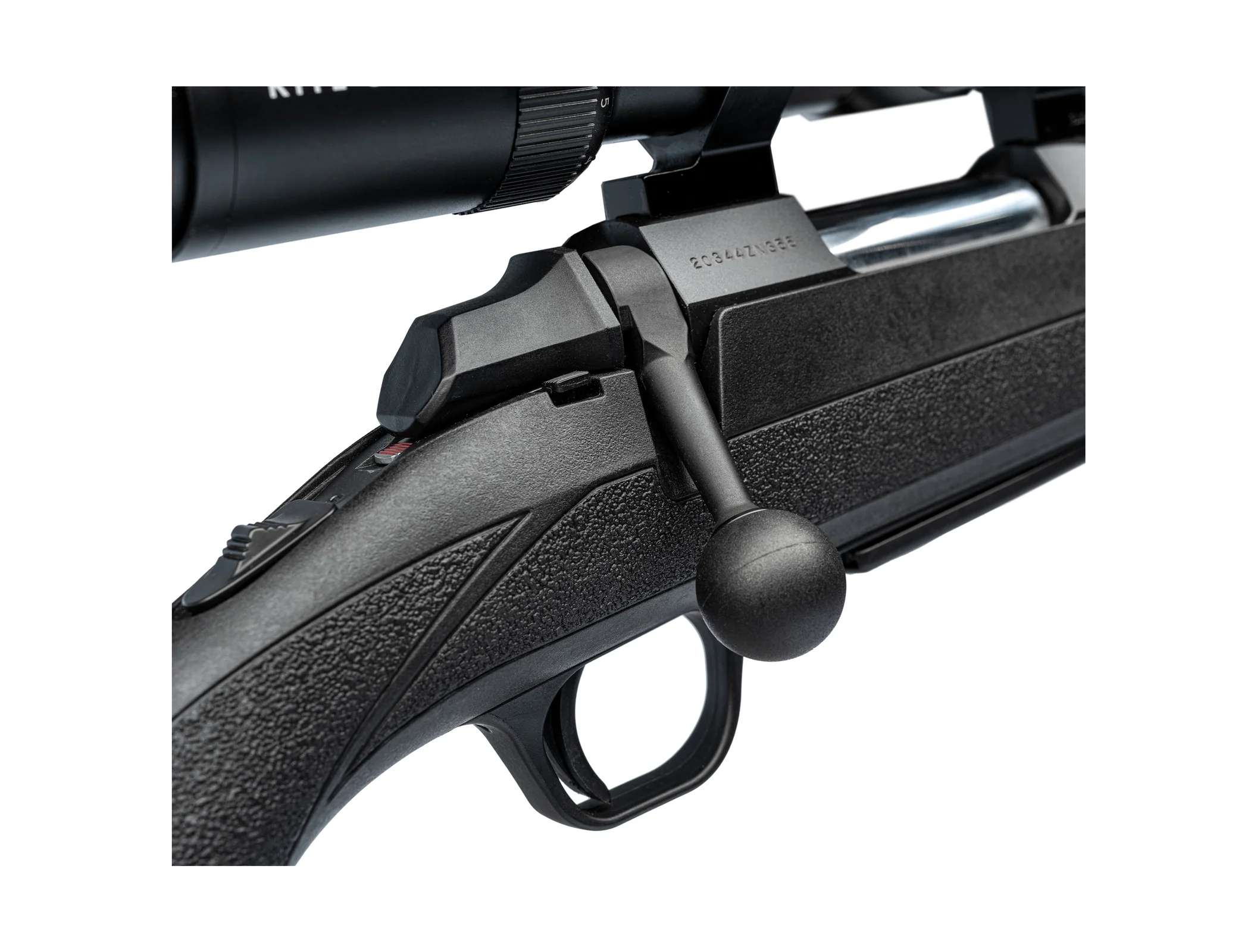 Aunque el A-Bolt 3+ Compo puede parecer sencillo a primera vista, ofrece una amplia gama de opciones de personalización. La culata tiene una carrillera negra que puede sustituirse fácilmente por otra de diferente color o por una garganta ajustable. El guardamano ancho y plano confiere una gran estabilidad a su rifle cuando se apoya sobre un soporte o silla de acecho. El guardamano también se puede cambiar.