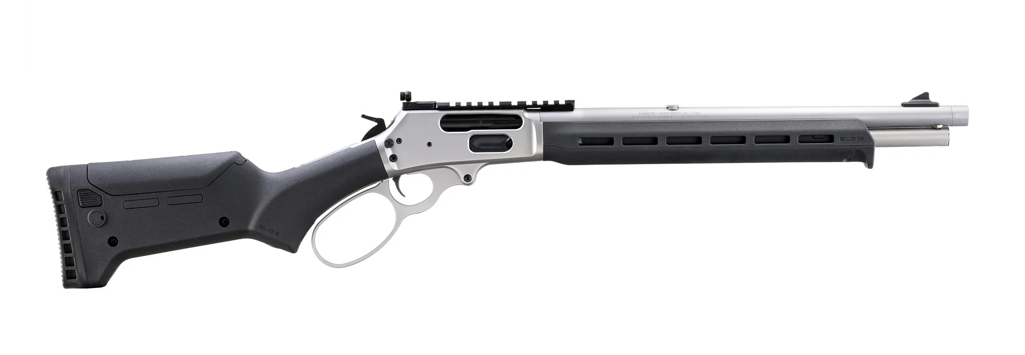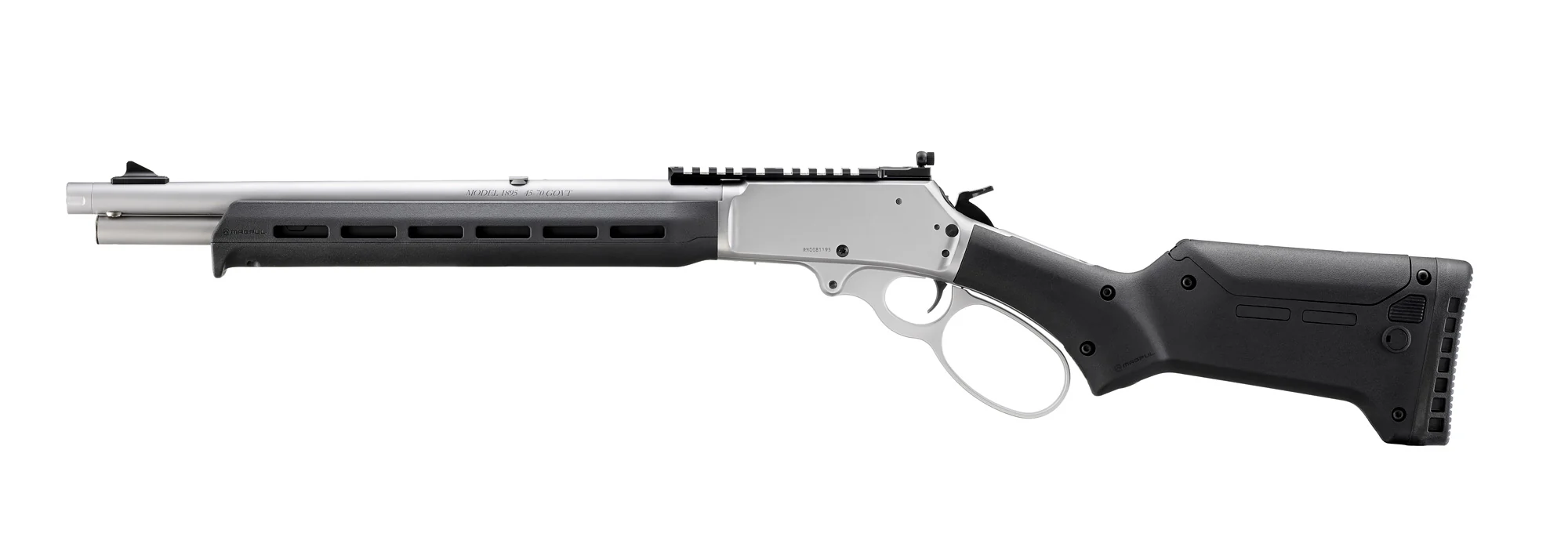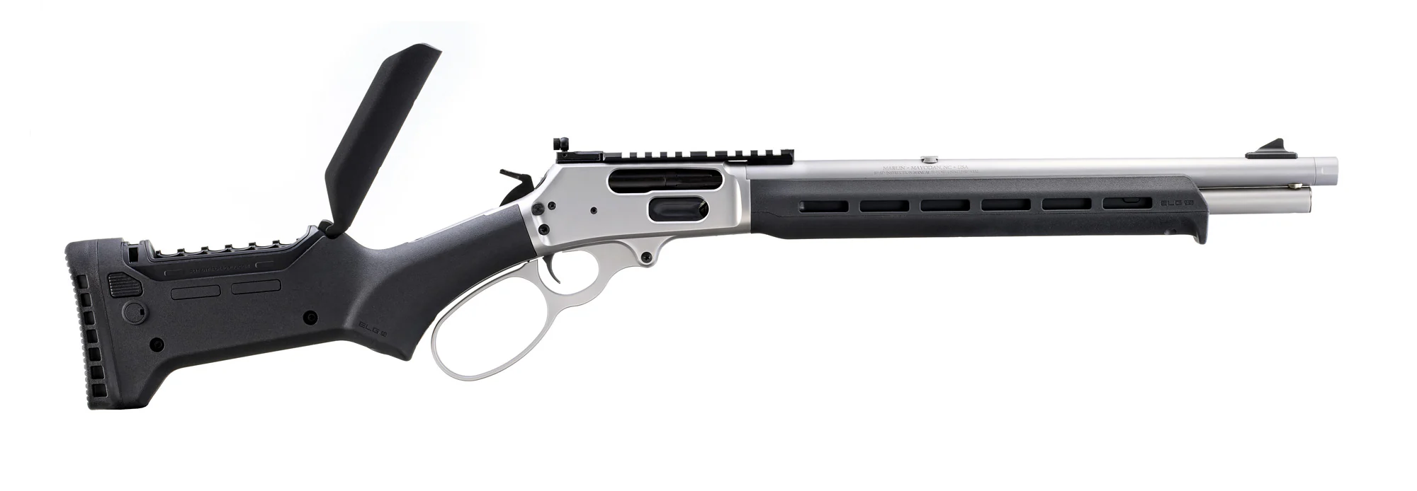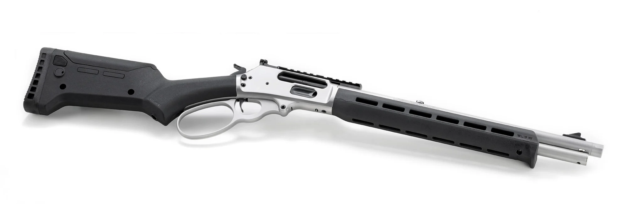 Basado en la misma plataforma que el Marlin 1895 SBL, el Marlin 1895 Trapper cuenta con un cañón más corto y maniobrable de 16.17″ (41 cm.) lo que le proporciona una longitud total de 33.25” (84,4 cm.). Viene en un acabado inoxidable satinado granallado para reducir el deslumbramiento. Está equipado con un cargador tubular que tiene capacidad para 5 balas, la culata sintética Magpul ELG y el gurdamanos con ranuras M-LOK® permiten montar una amplia variedad de accesorios. Utiliza un lazo sobredimensionado en la palanca de la casa Wild West Guns. Este tipo de lazo es ideal para poder operar el arma con guantes o para usuarios con manos muy grandes.
