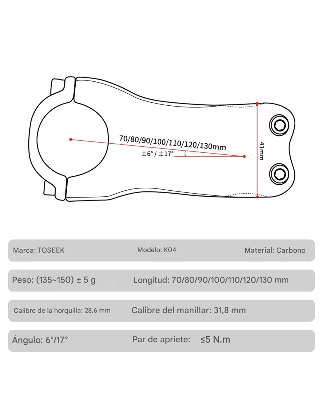 - Longitud del vástago (C-C): 70/80/90/100 mm