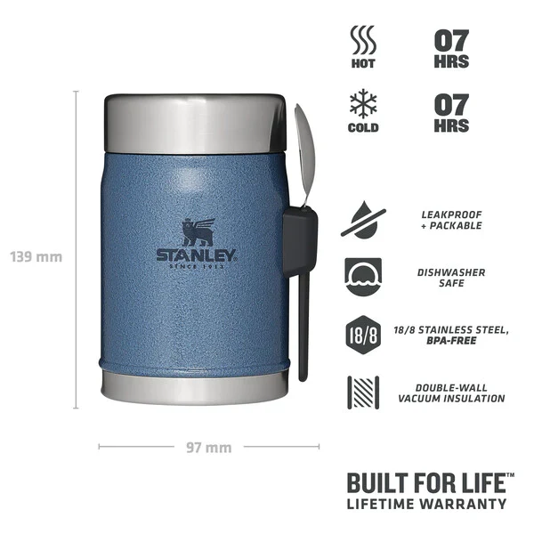 Este tarro de comida para la carretera o el camping tiene todo lo necesario. Compacto, pero con espacio de sobra para su receta caliente o fría favorita. Tapa aislada con válvula de liberación de presión para facilitar la apertura. La amplia abertura de la boca de la jarra aislada al vacío facilita el llenado, el vertido y la limpieza. Todas las piezas de este recipiente de acero inoxidable son aptas para el lavavajillas, sólo en la rejilla superior. Y por último, pero no por ello menos importante, un tenedor de acero inoxidable que encaja firmemente en el soporte lateral. ¡Buen provecho!