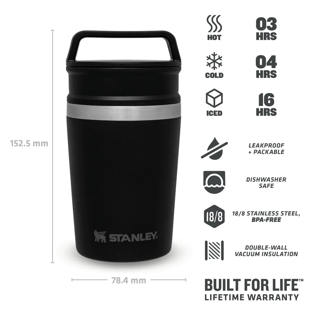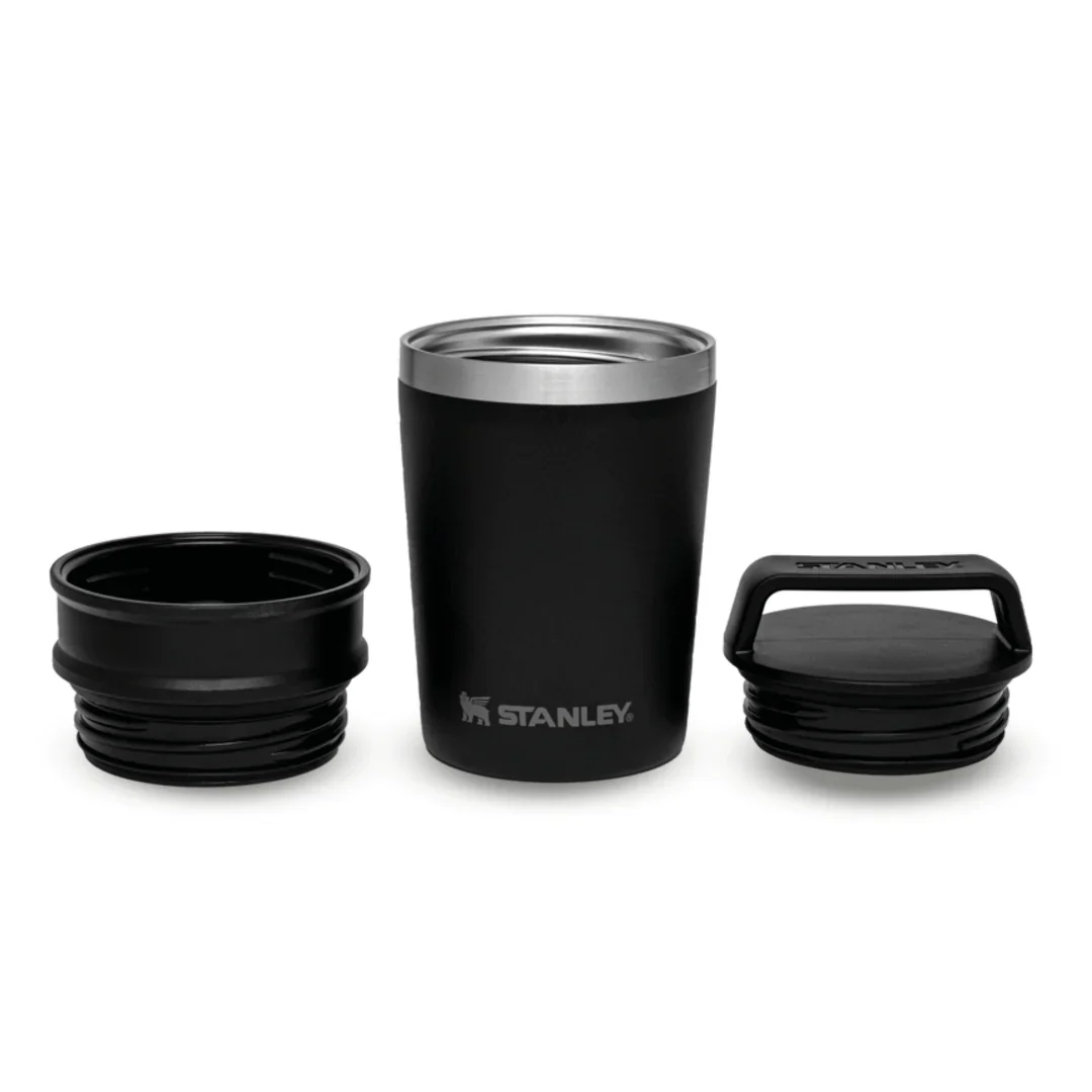 Pequeña en tamaño, pero hecha para rendir a lo grande. Esta taza de viaje compacta puede mantener caliente un espresso doble o frío un whisky con hielo durante horas. Una exclusiva tapa de 2 piezas mantiene tus bebidas a raya: es totalmente hermética, pero también permite beber a sorbos.